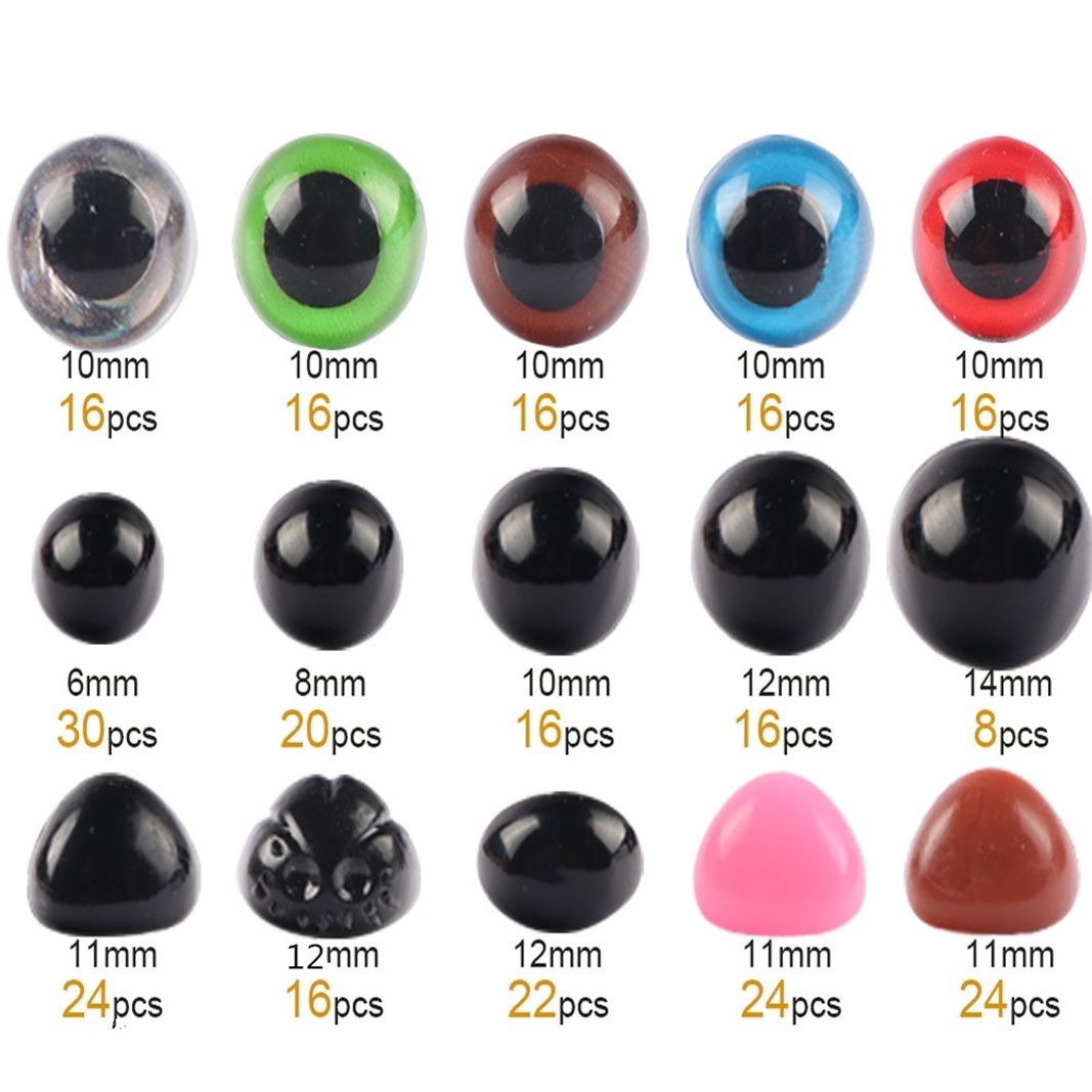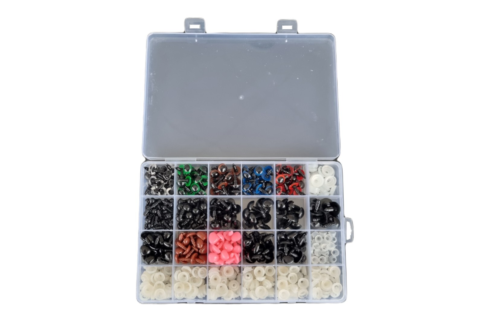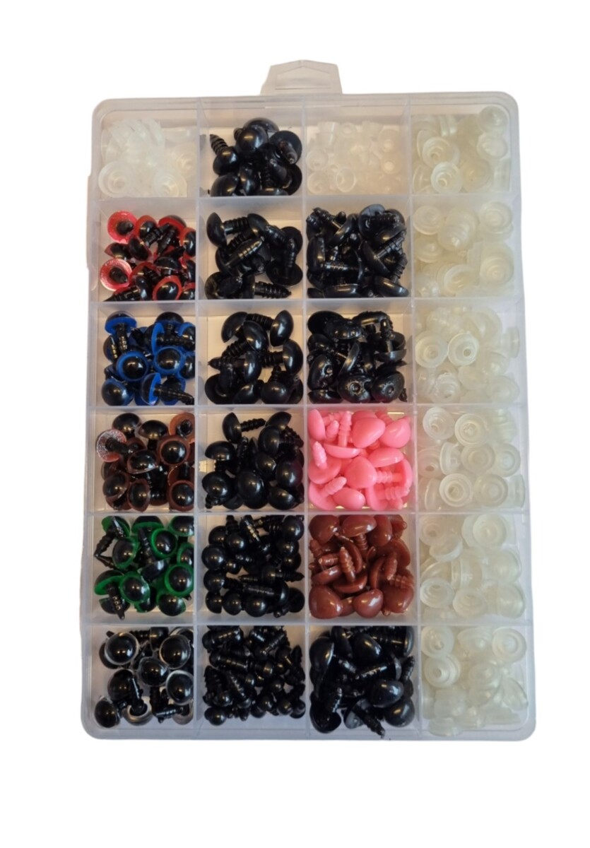 280 st/fp. Enkla att applicera på tyg och andra material. Innehåller: ögon 10 mm i fem olika färger, 16/färg. 90 svarta ögon i fem olika storlekar: 6, 8, 10, 12 och 14 mm. 110 nosar i olika storlekar och färger. 280 låsringar. Levereras i praktisk plastlåda med fack. Av harts och polystyren. Låda av PP. Fritt från PVC.