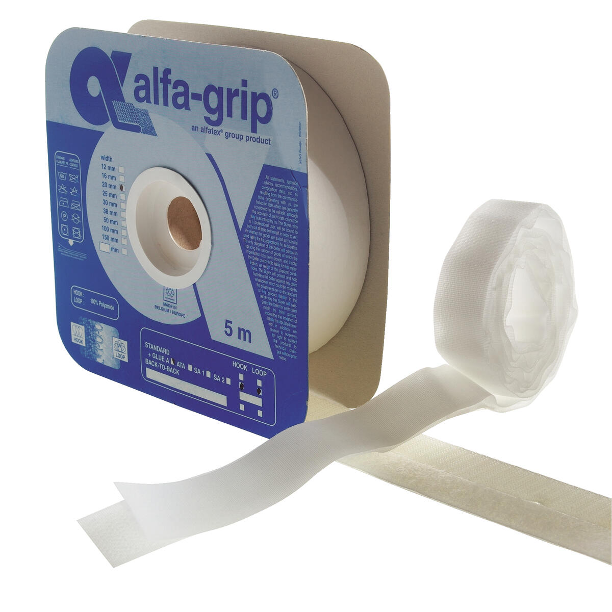 5 m/rulle. Självhäftande. Bredd 20 mm. Komplett med hakband och fästband. OEKO-TEX®-certifierad, klass I (Standard 100). PVC-fri.
