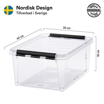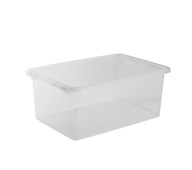 Transparent förvaringsbox med lock. Rymmer 25 l. Största mått: 40x30x32 cm. Av polypropen.