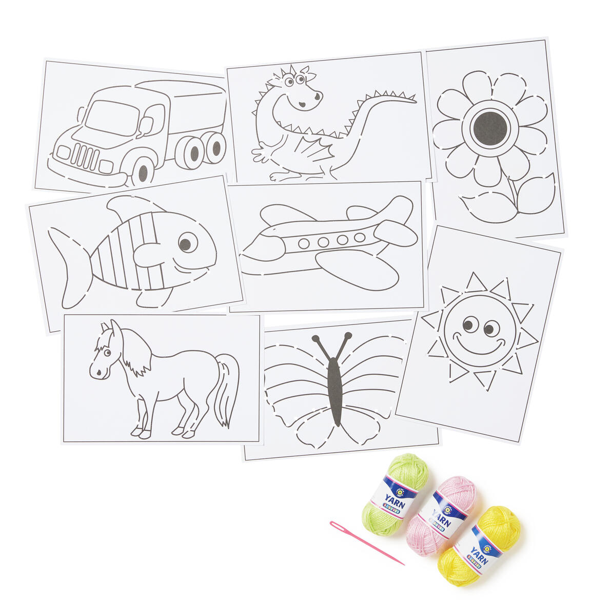 48 kort/fp. Sykort med förtryckta motiv som kan färgläggas och broderas. Innehåller 6 kort vardera av de 8 motiven häst, fisk, fjäril, drake, sol, blomma, flygplan och lastbil. Mått 17x11 cm. Tillverkade av stadig 300 g kartong