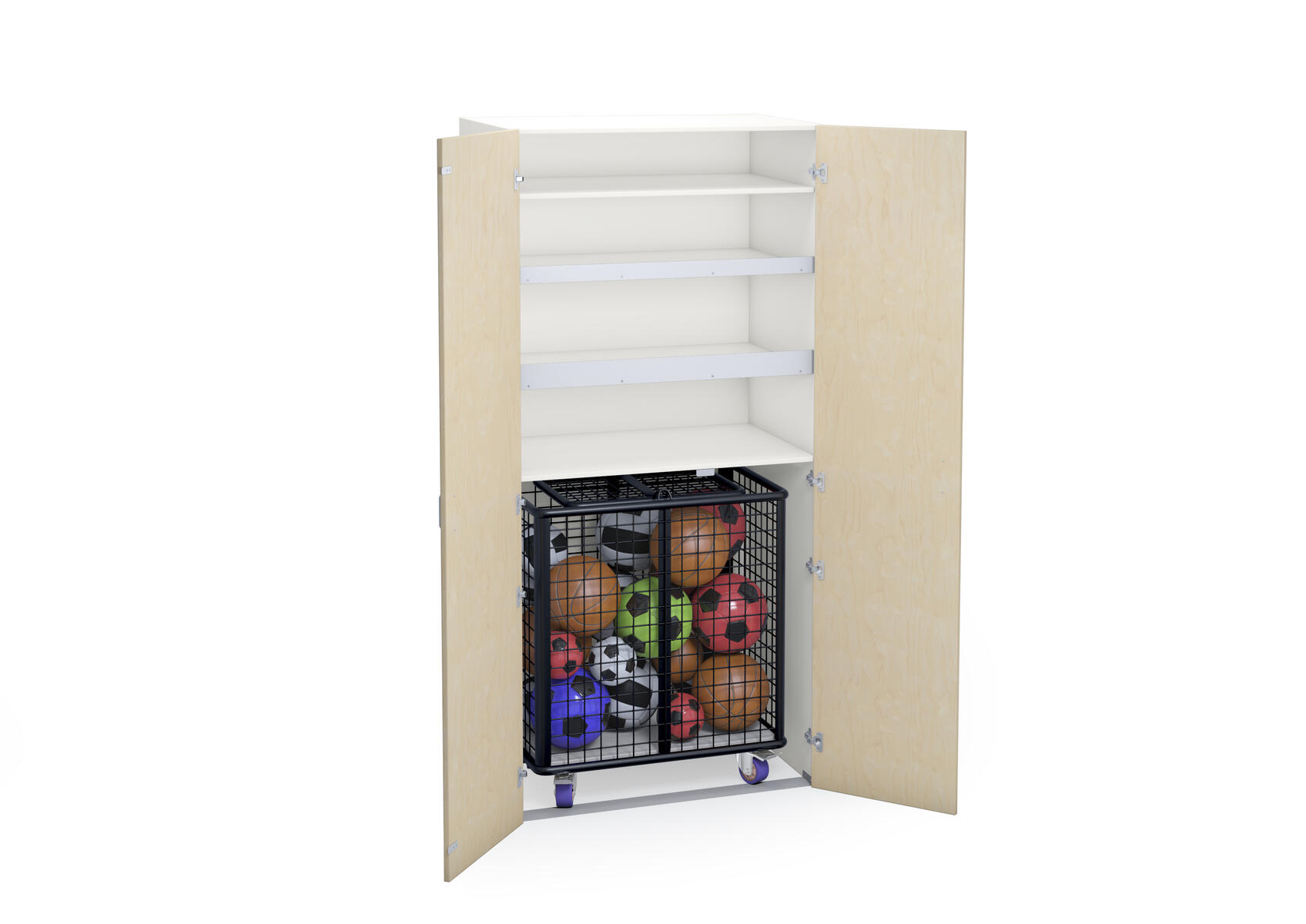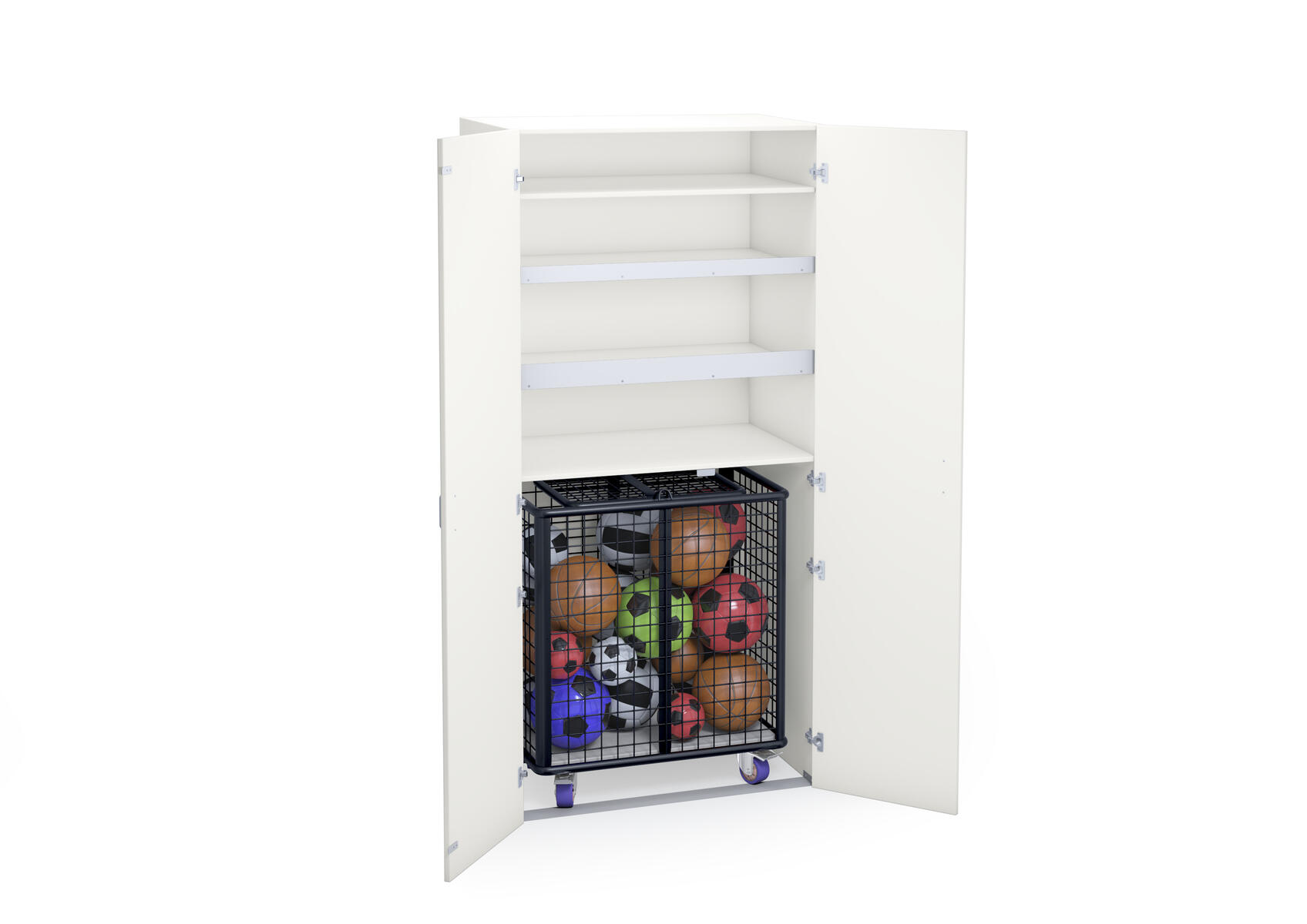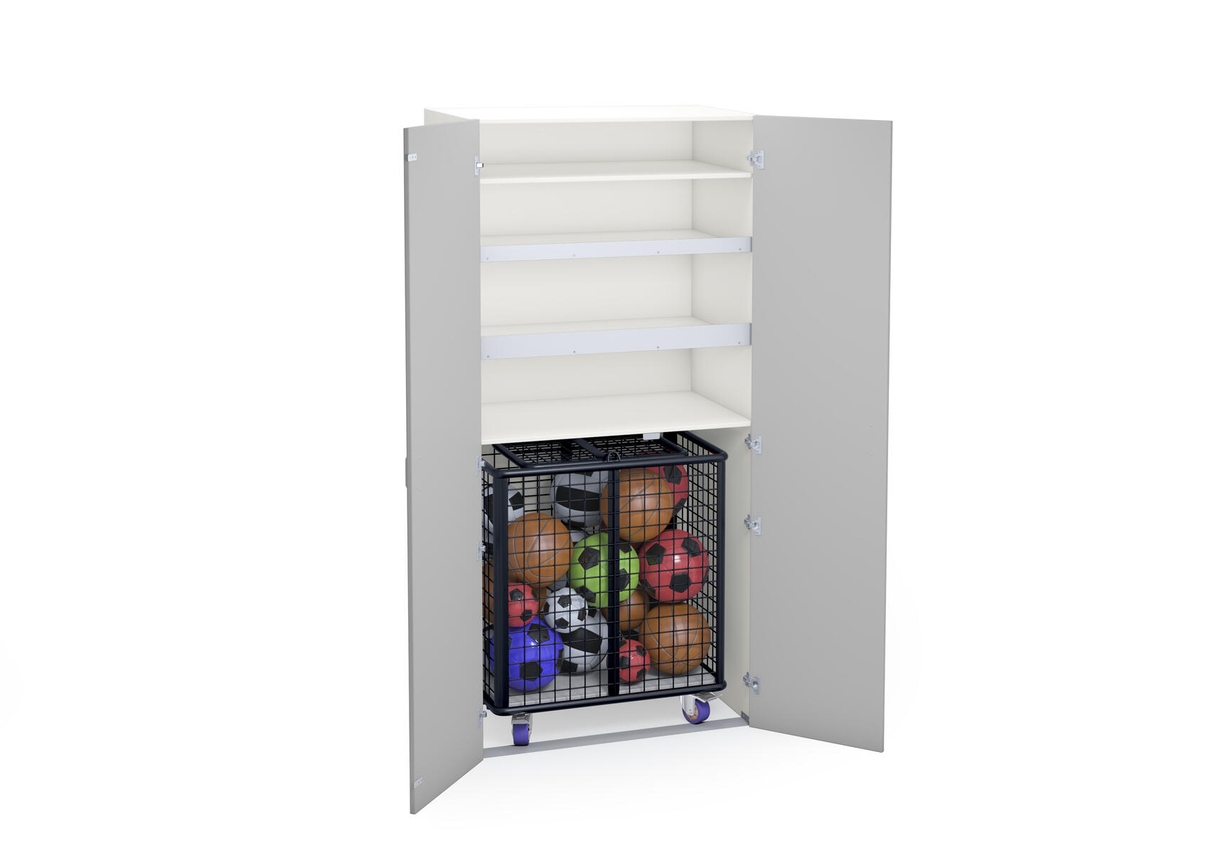 Materialskåp för sportredskap med stomme i direktlaminat. Fronter kan fås med antingen direktlaminat eller högtryckslaminat. Inredd med hyllplan och ett fack för en förvaringsvagn, art.nr 74980. Skåpet har 2 hela dörrar med spanjolettlås (inkl. 2 nycklar), 170 graders öppningsvinkel. Högtryckslaminat på fronten gör att den får en extra tålig yta.
