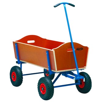 En stor och gedigen vagn av vattenavvisande plywood och stålkonstruktion. Skrindan har luftgummihjul med plastfälgar och lager, vilket gör att den rullar väldigt lätt. Vagnens sidor går att plocka bort för att spara plats vid förvaring eller transport. Anvisning medföljer. PVC-fri.
