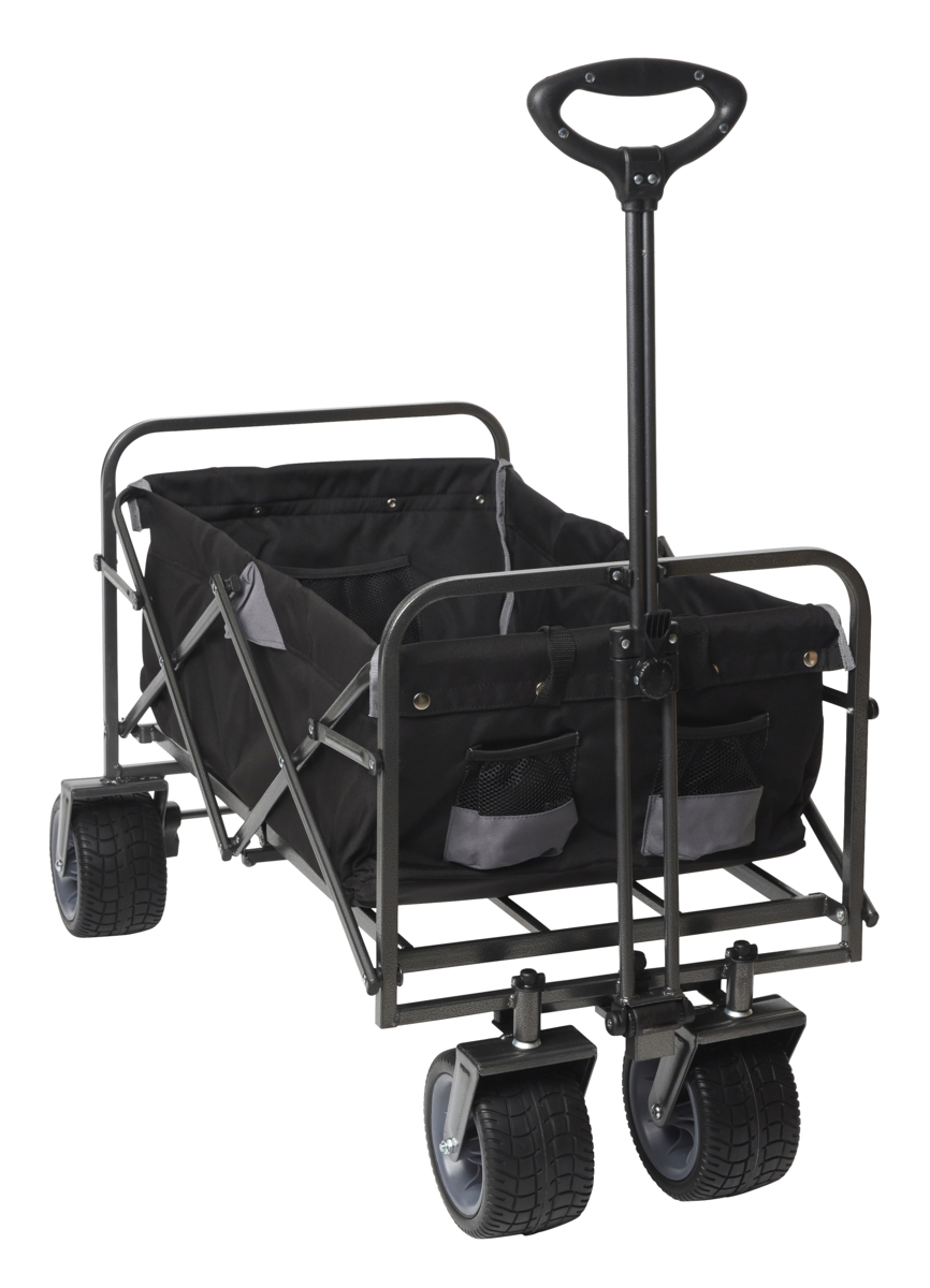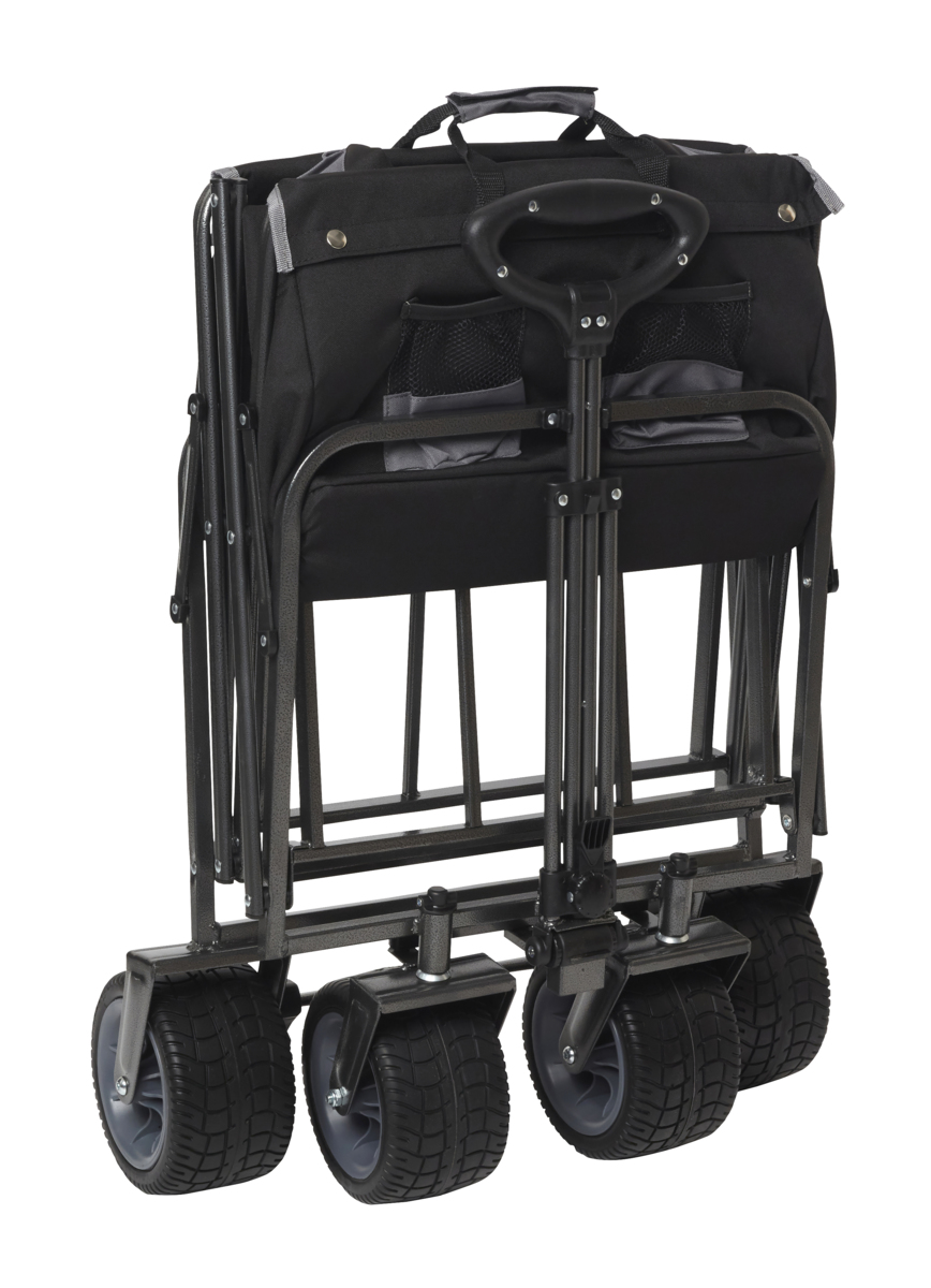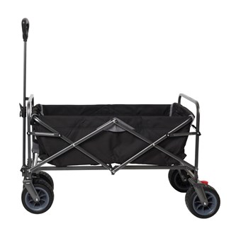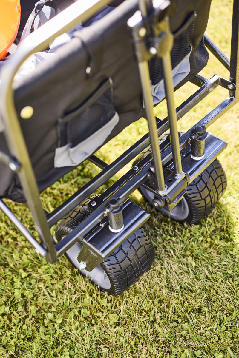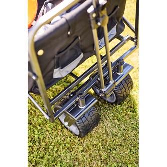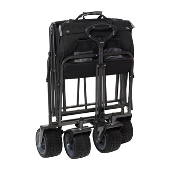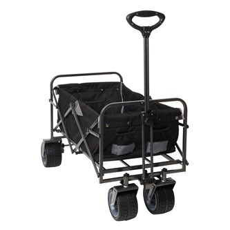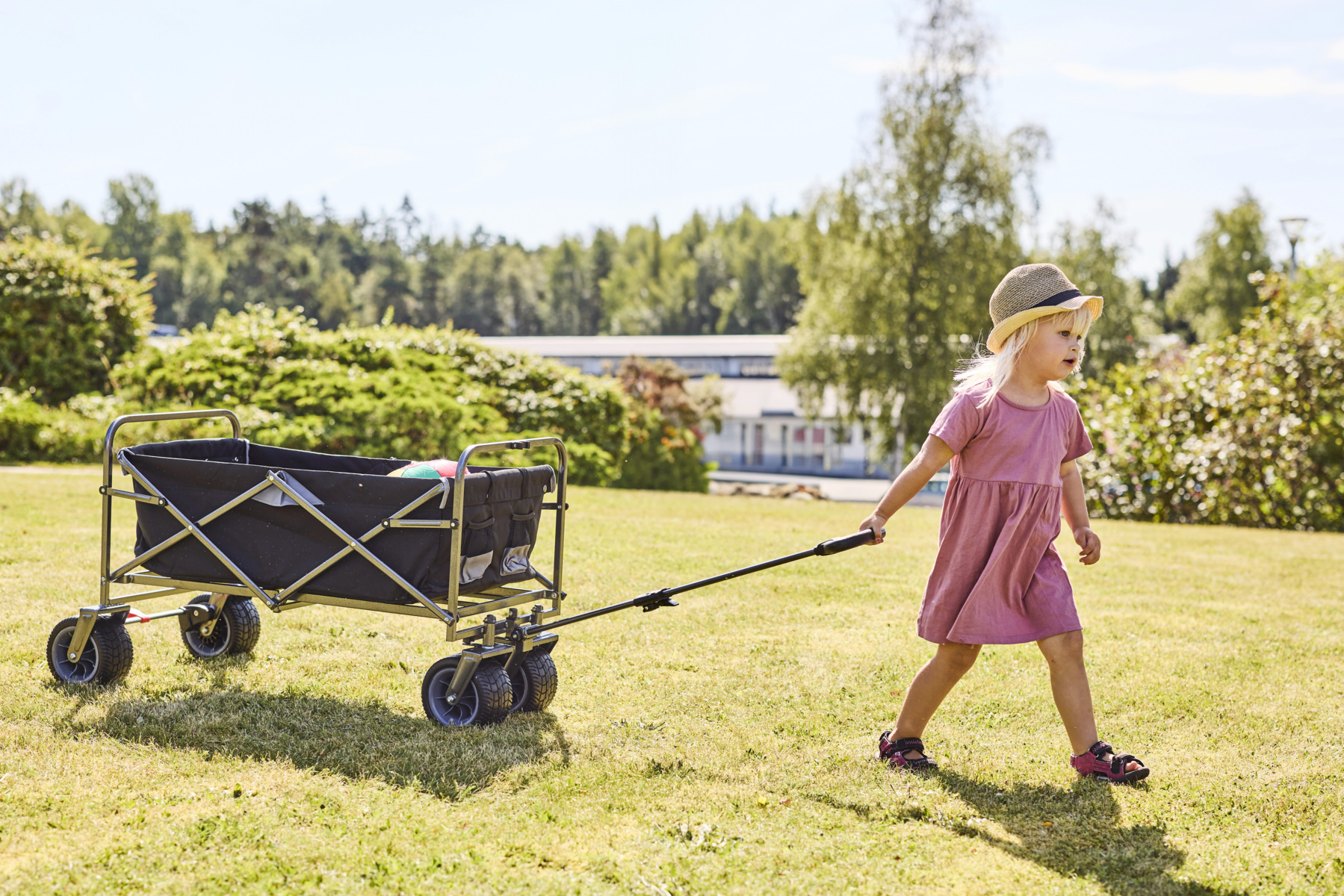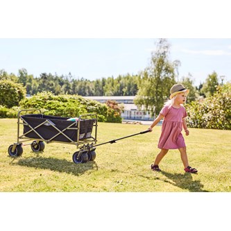En praktisk vagn att packa i när det är dags för utflykt. Vagnen är mycket stabil och passar både i skogen och i stan. Punkteringsfria däck med kullagerhjul gör att vagnen rullar lätt. Säcken skyddar väl mot regn, har ett stängbart lock och kan tas av från chassit och bäras i handtagen. Stort packutrymme om 47 l och en mindre ytterficka på framsidan. Hopfällbart aluminiumchassi. Mått: chassi 50x50x108 cm. Mått säck 20x34x60 cm. Hjulstorlek 25 cm. Maxlast 50 kg.