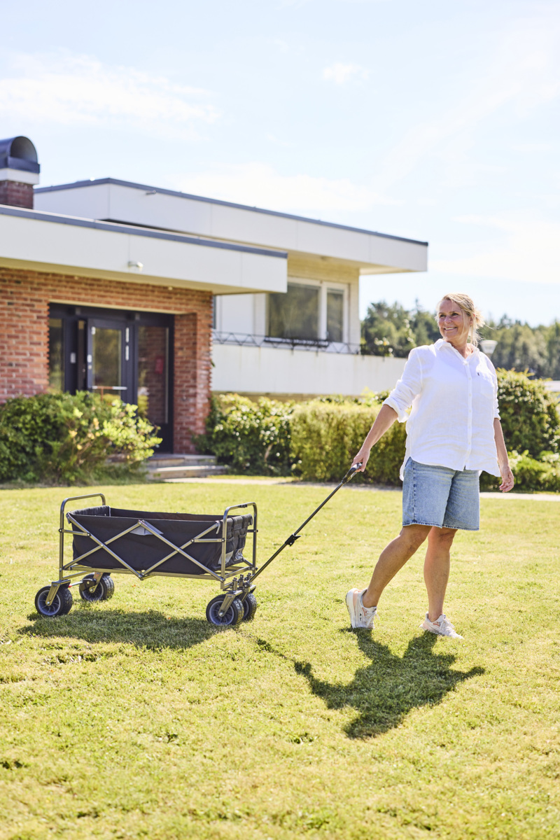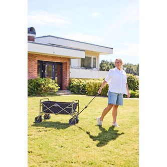En hjälpreda när man behöver ha saker med sig ut på tur (inte avsedd för att köra barn i). Innerskydd, regnskydd och en liten metallbricka medföljer. Handtaget går att koppla loss. Försedd med luftgummihjul. Mått: 113x51x56 cm. Flaket är 90,5x48 cm. Maxvikt: 350 kg. Av stål, PE och polyester.