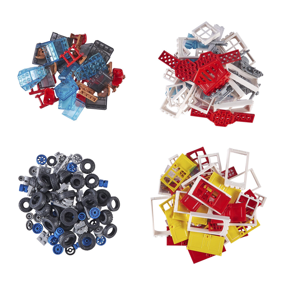 250 delar. Tillbehörssats med hjul, fönster och dörrar i olika storlekar, färger och former för kreativ bygglek. Passar ihop med andra liknande fabrikat på klossar. Levereras i praktisk förvaringslåda med lock. Byggförslag medföljer. Av ABS. PVC-fri. Från 3 år.