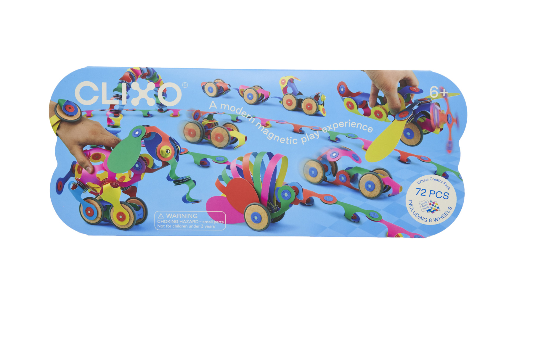 72 delar. Med Clixo kan du enkelt bygga färgglada och kreativa kreationer. I detta set kan du sätta fart på dina kreationer med Clixos hjul. De mjuka delarna klickas enkelt ihop med magneter och kan skapa spännande konstruktion med rundade former Clixobitarna är gjorda av återvinningsbart och slitstarkt papper med starkt inbäddade magneter för maximal säkerhet. Av PET, ABS. Från 6 år.