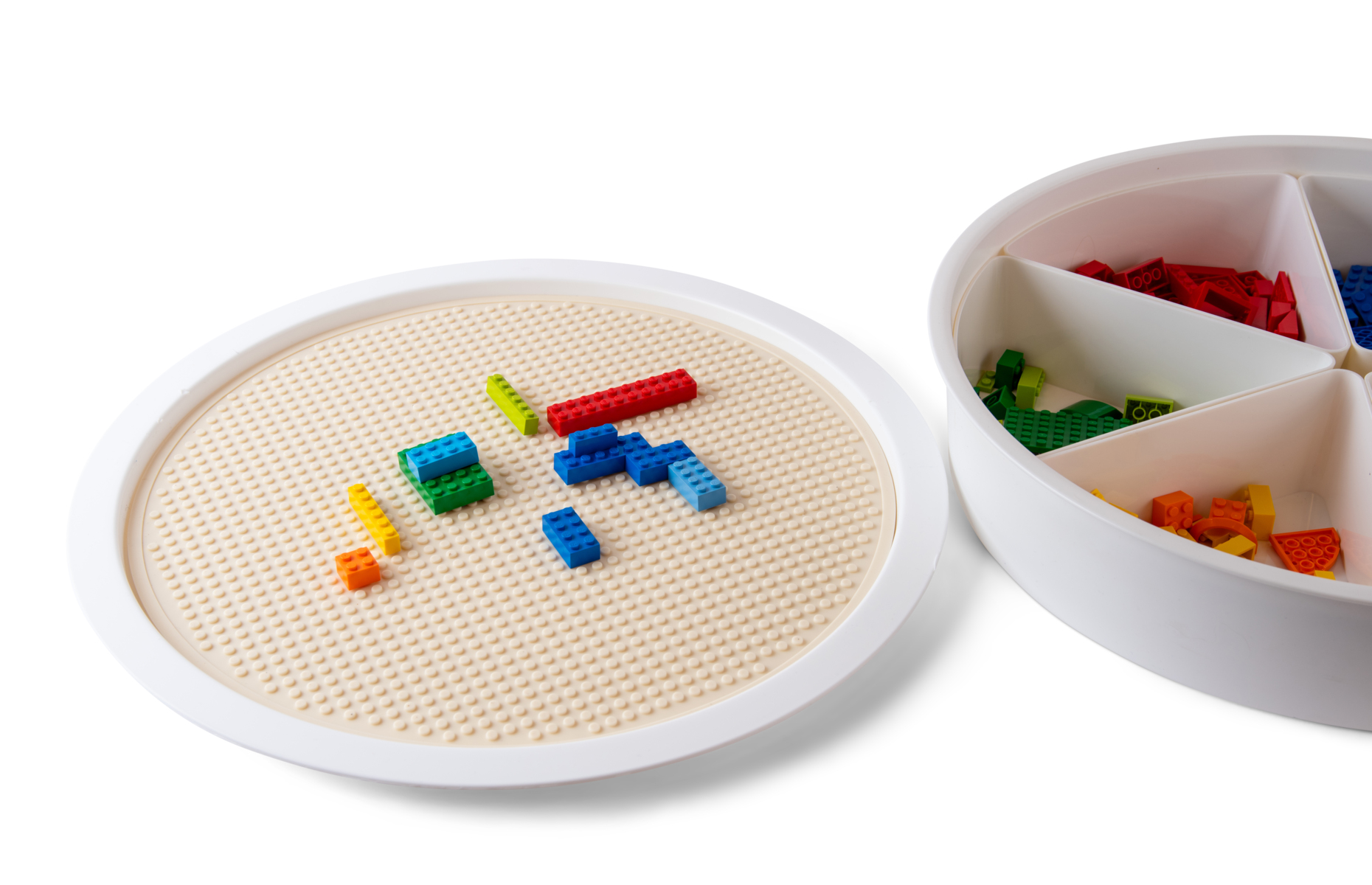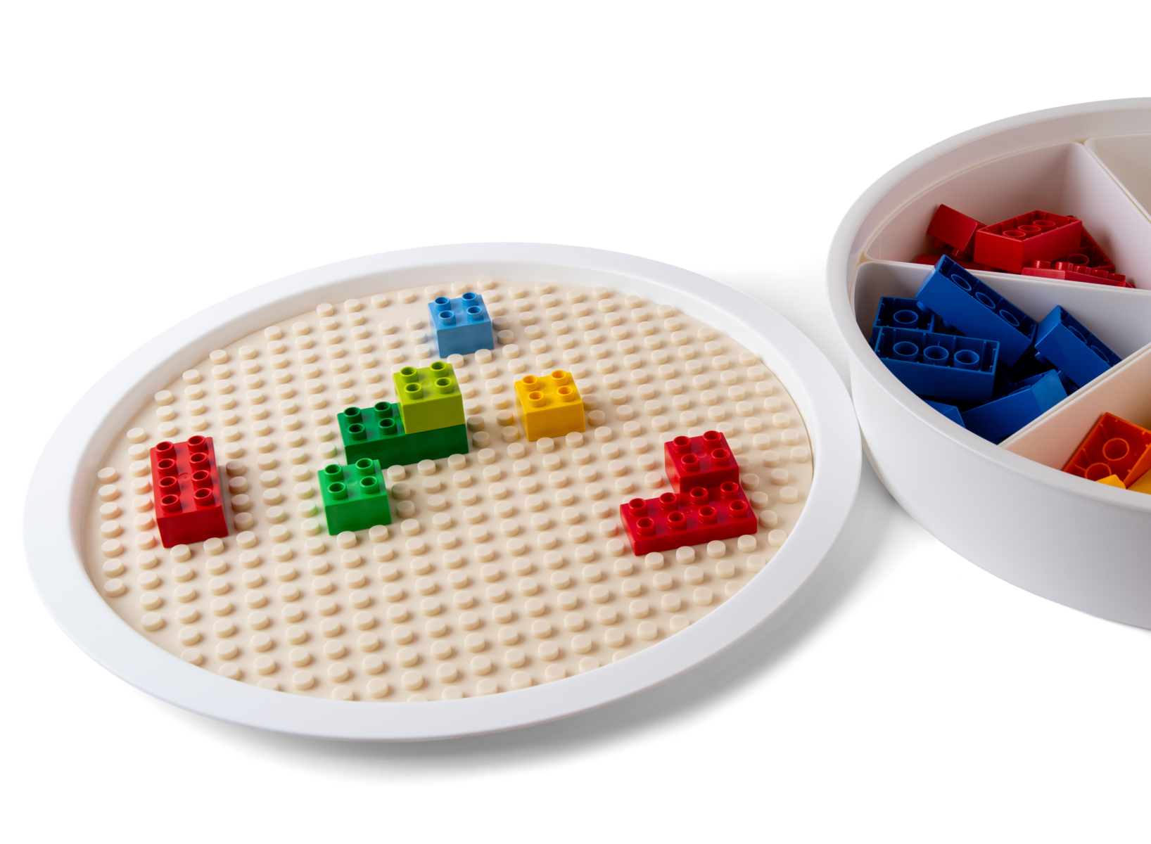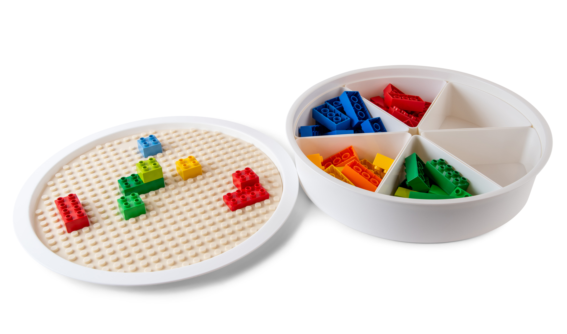 Sensorisk sorteringslåda med avtagbara fack och lock. Lätt att rengöra, flytta runt och förvara. Kompletteras med en flexibel dubbelsidig byggklossmatta av silikon. Den ena sidan kan användas för små byggklossar och den andra för lite större byggklossar. Passar med ledande varumärken av byggklossar. Storlek: 45x45x11,5 cm. Av resin. PVC-fri. Från 3 år.