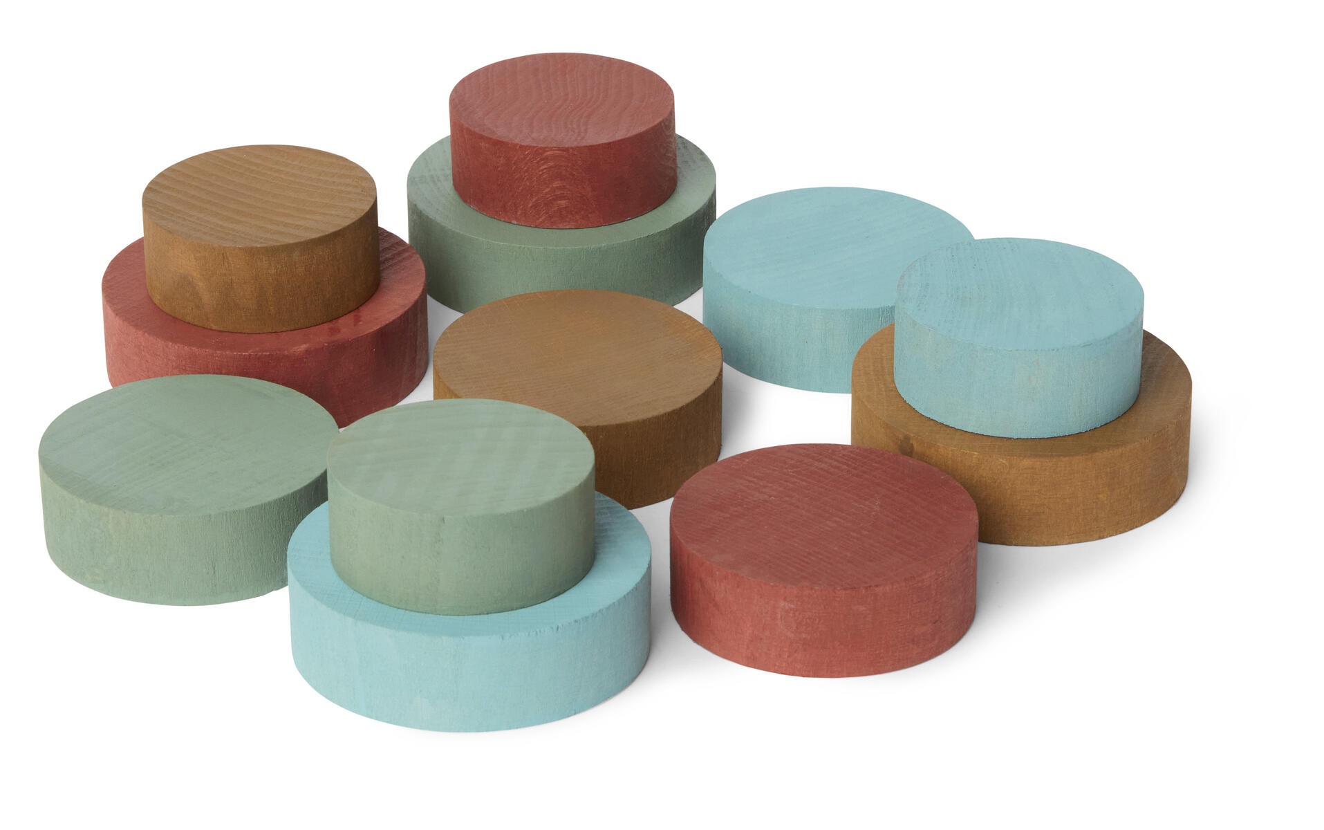 12 delar. Enkla skivor i olika storlekar och färger. De kan rullas, staplas på varandra eller sorteras efter färg och storlek. En härlig resurs att använda i lösa delar eller i en matematikaktivitet. Största discen är ø 7 cm och minsta är ø 3 cm. PVC-fri. Från 3 år.