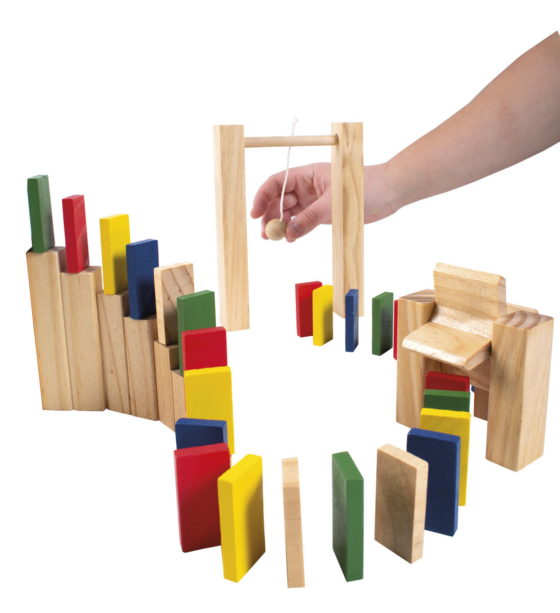 107 delar. Bygg din egen roliga dominobana. Brickor av trä. Innehåller brickor, bro, klocka och andra trick. Av FSC- märkt trä, ABS, TPE och metall. PVC-fri. Från 3 år.