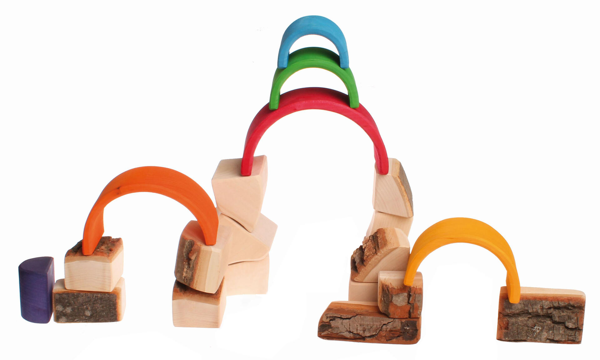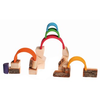 12 delar. Byggset i trä där bitarna tillsammans skapar en vacker regnbåge. Bitarna kan användas som t.ex. tunnlar och broar tillsammans med andra typer av klossar. Yngre barn kan stapla och sortera klossarna. Målade med giftfria, vattenbaserade färger. PVC-fri. Från 0 år.