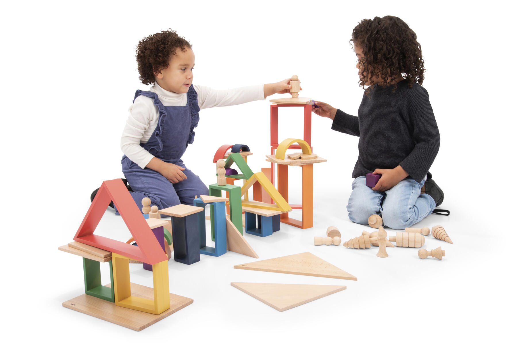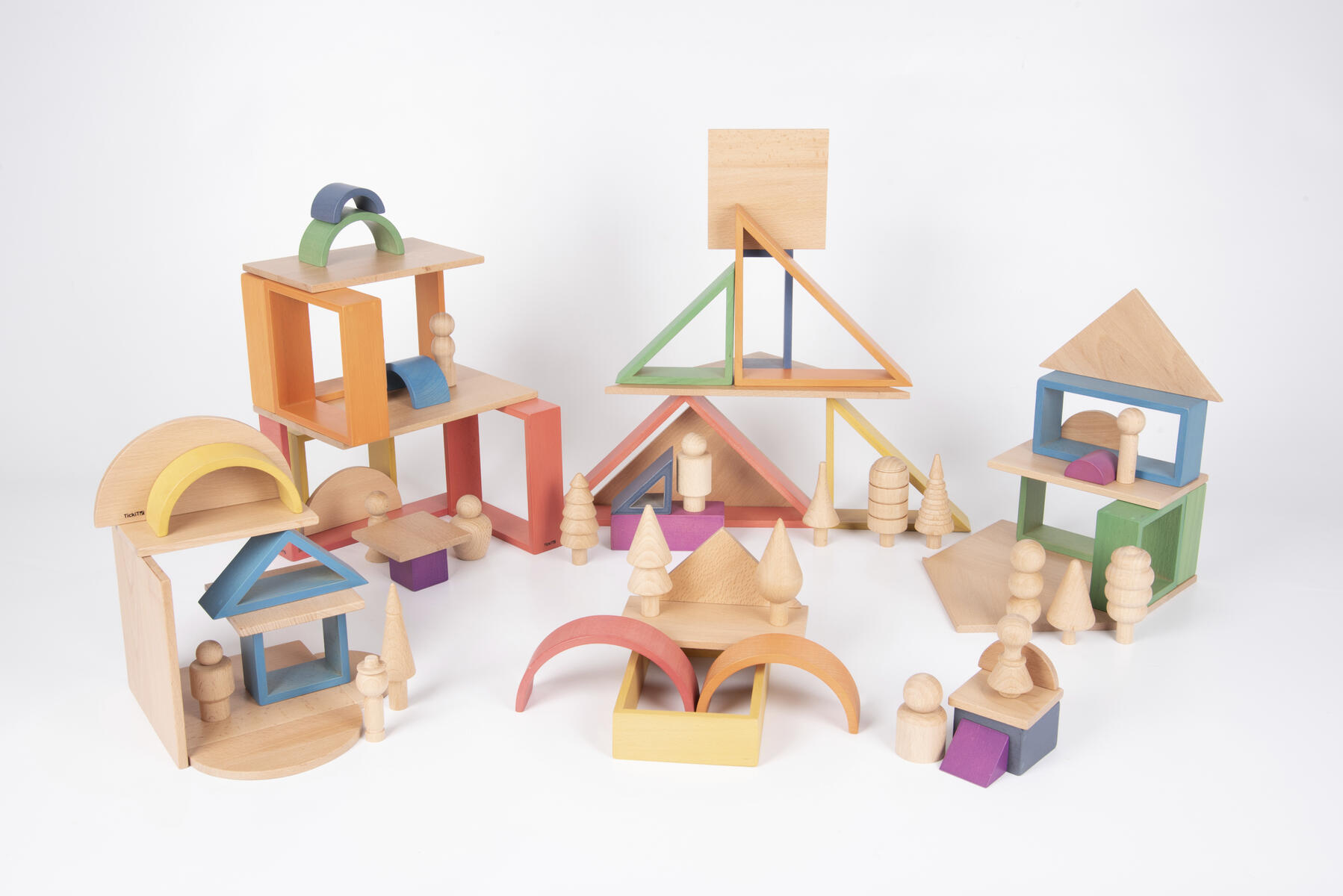 Ett set med 28 vackert färgade klossar i olika geometriska former: kvadrater, trianglar, rektanglar och halvcirklar. Perfekta för konstruktion och fantasifull lek. Tränar logik, sortering, geometri, vokabulär etc. Av bokträ. PVC-fri. Från 1 år.