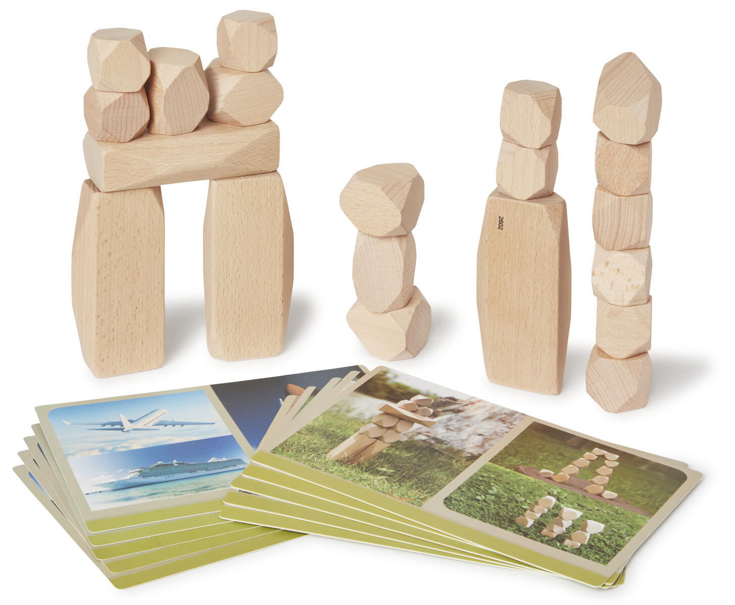 20 st/fp. Olikformade träklossar som främjar barnens nyfikenhet. Varje träkloss har slipats fint för att lyfta fram de naturliga tonerna i träbitarna. De olika storlekarna hjälper barnen att förstå vikt, gravitation och relationer. Inspirationskort som uppmuntrar till att kreativt stapla och bygga ingår. Av bokträ. PVC-fri. Från 2 år.
