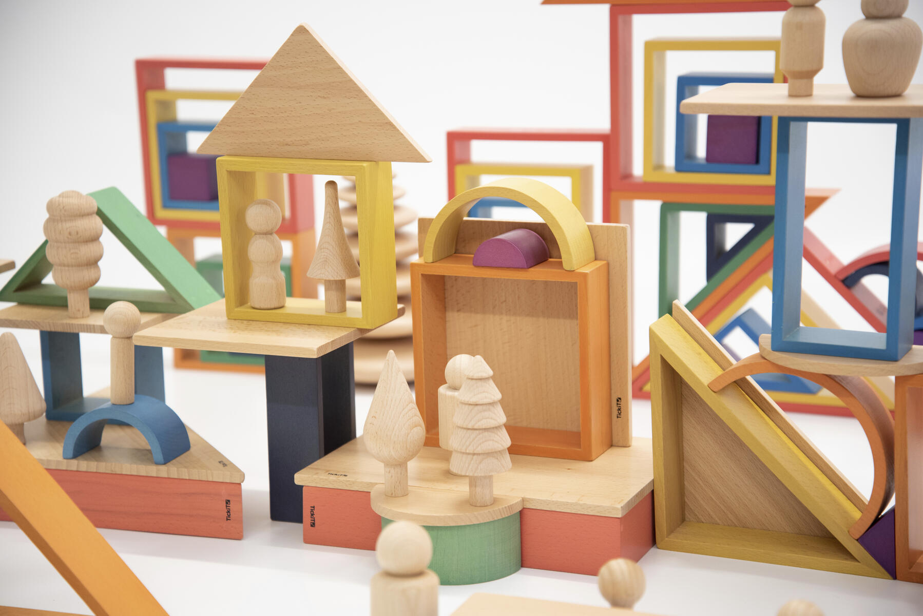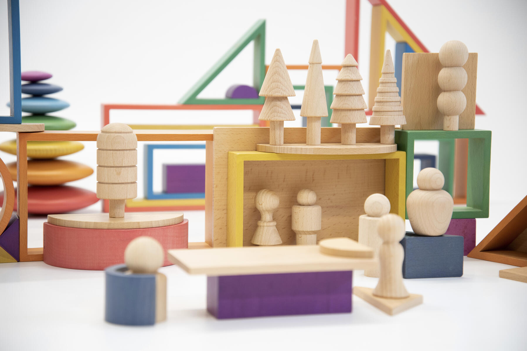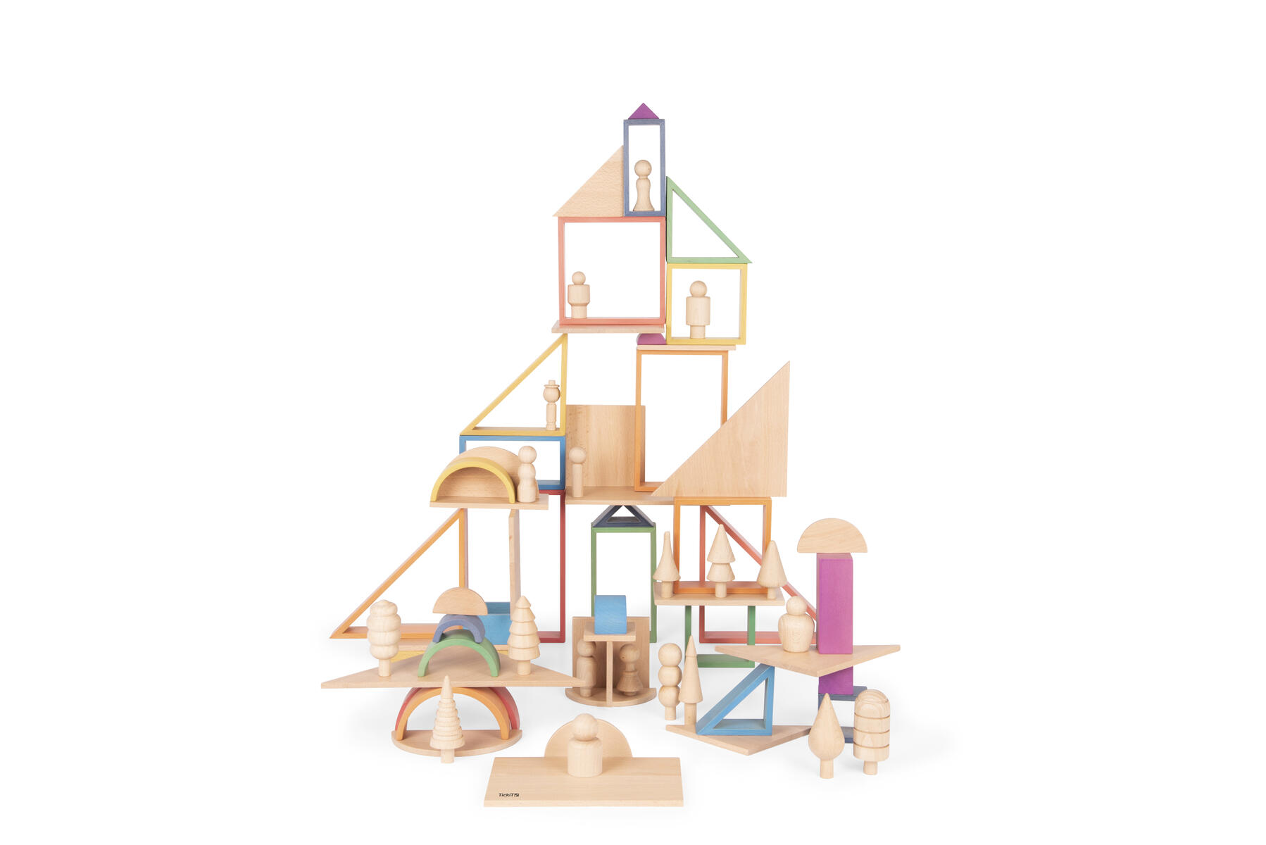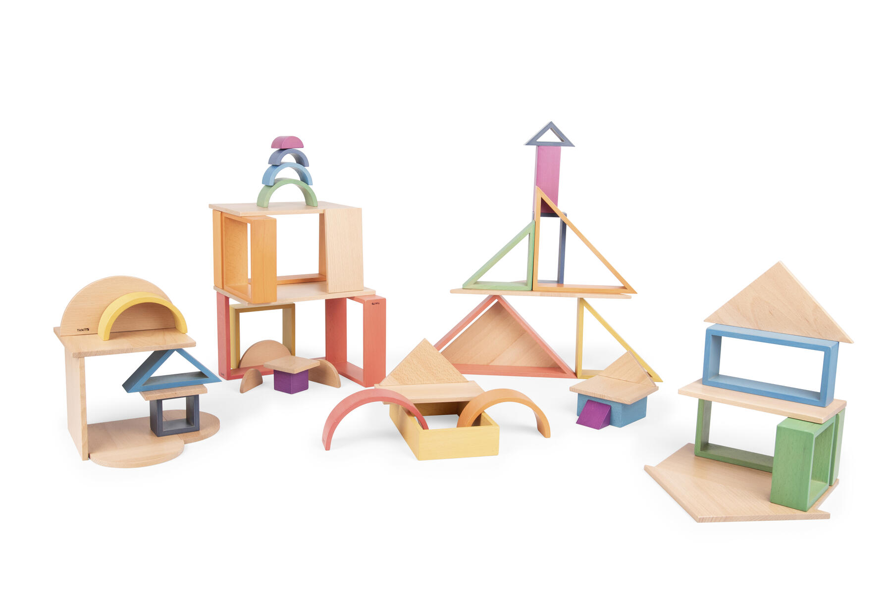 Ett set med 28 vackert färgade klossar i olika geometriska former: kvadrater, trianglar, rektanglar och halvcirklar. Perfekta för konstruktion och fantasifull lek. Tränar logik, sortering, geometri, vokabulär etc. Av bokträ. PVC-fri. Från 1 år.