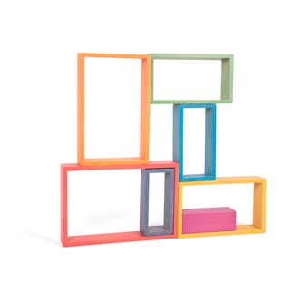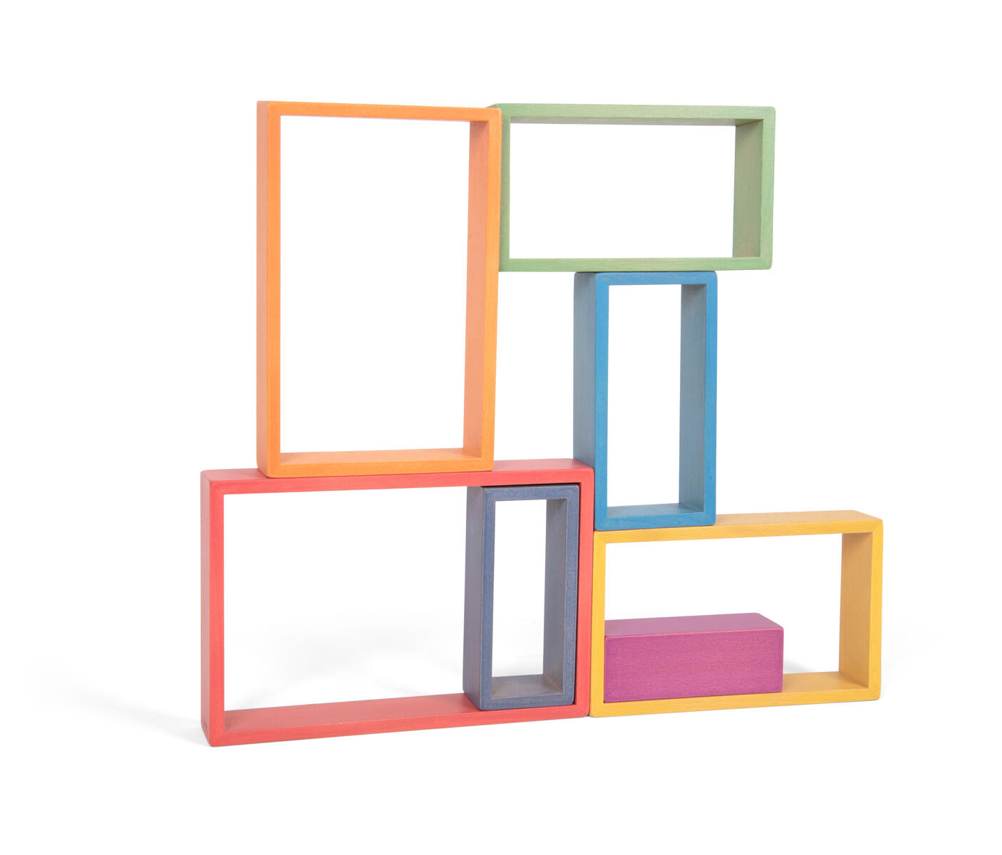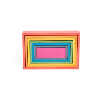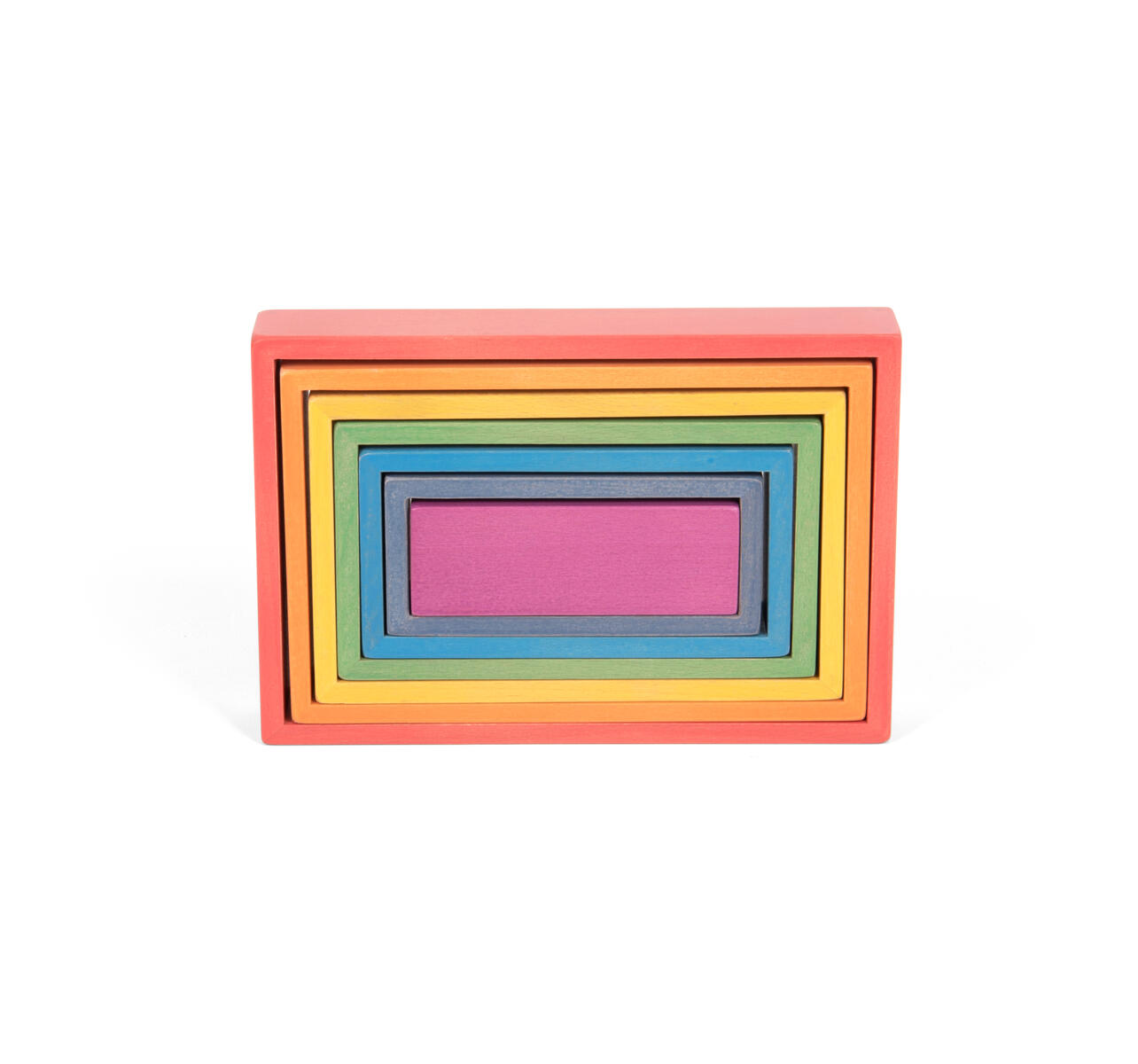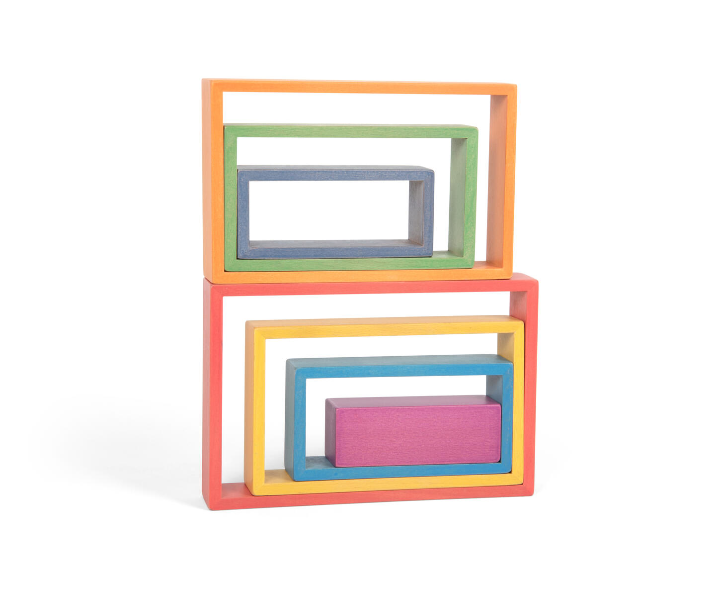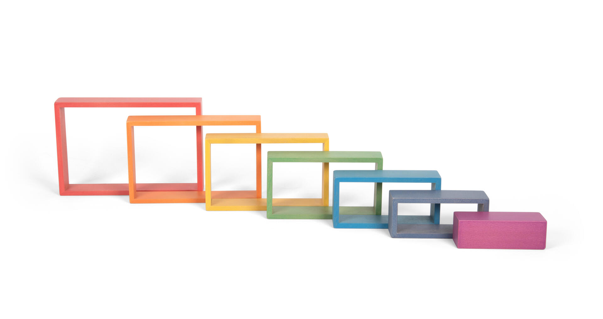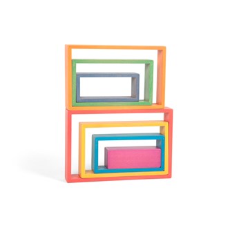 7 delar. Vackert färgade rektanglar av bokträ i 7 fäger i stigande storlek. Det inre blocket är en solid 3D-rektangel. Perfekta för konstruktion och fantasifull lek, och tränar logik, sortering, geometri, vokabulär etc. Höjd mellan 4-15 cm, längd på största 22 cm. PVC-fri. Från 1 år.