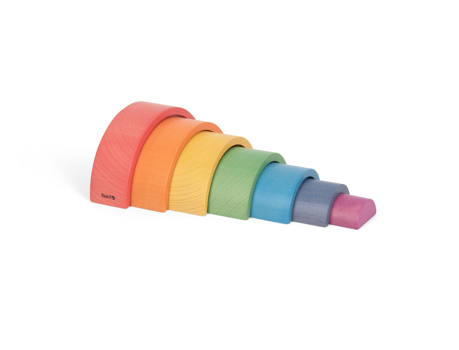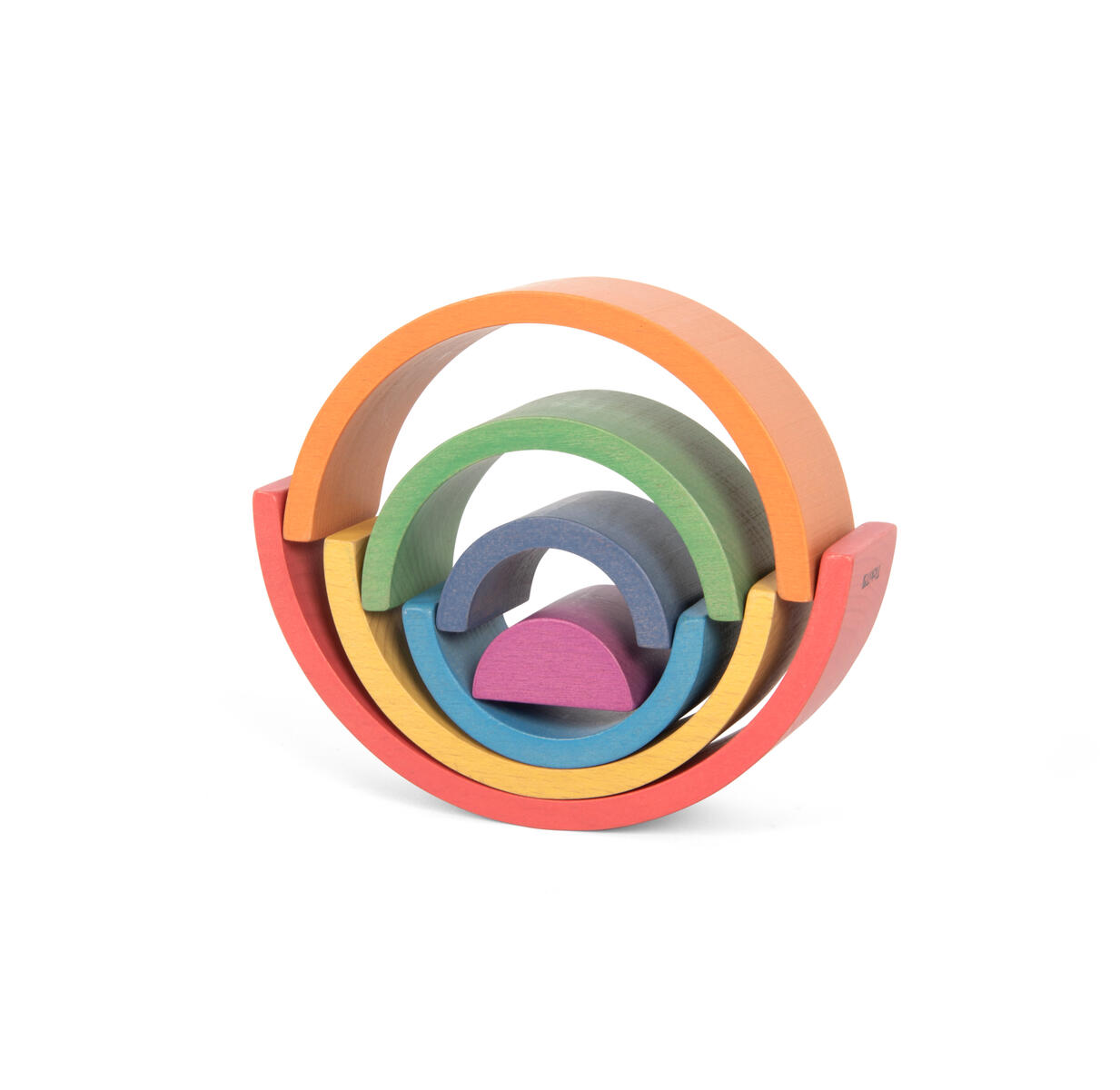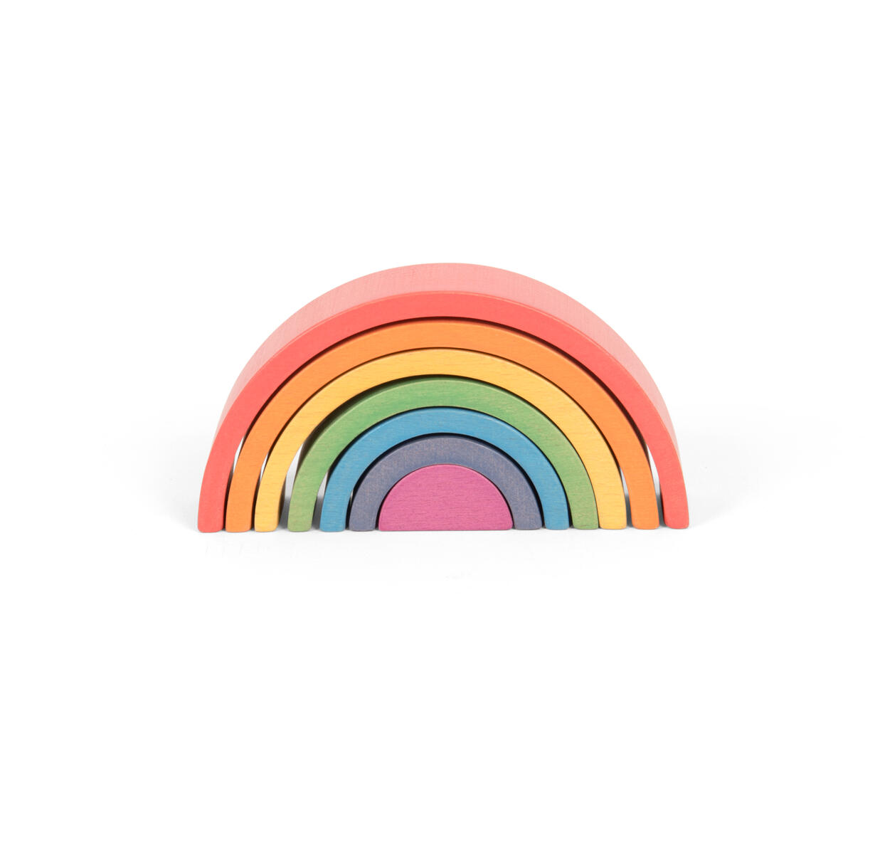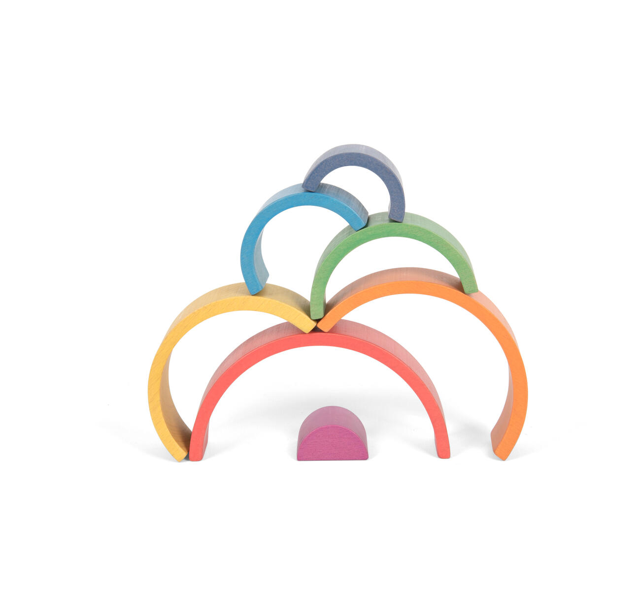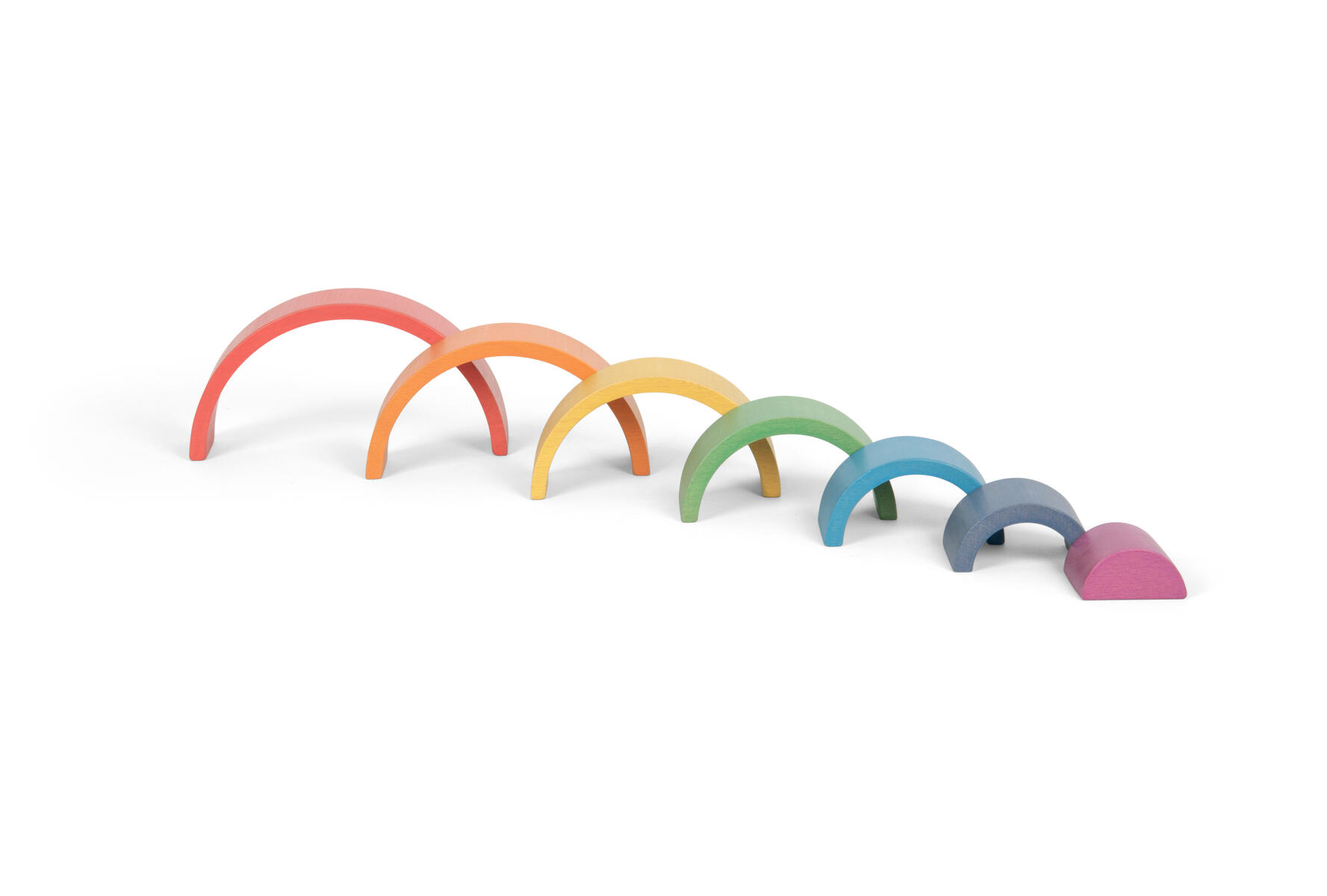 7 delar. Vackert färgade valv av bokträ i 7 delar i lika många färger i stigande storlek. Det inre blocket är en solid 3D-halvcirkel. Perfekta klossar för konstruktion och fantasifull lek, och tränar logik, sortering, geometri, vokabulär etc. Höjd mellan 1,9-7,3 cm, längd på den största är 15 cm. Från 1 år. PVC-fri.