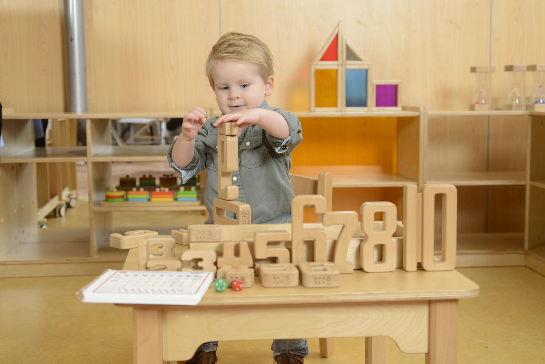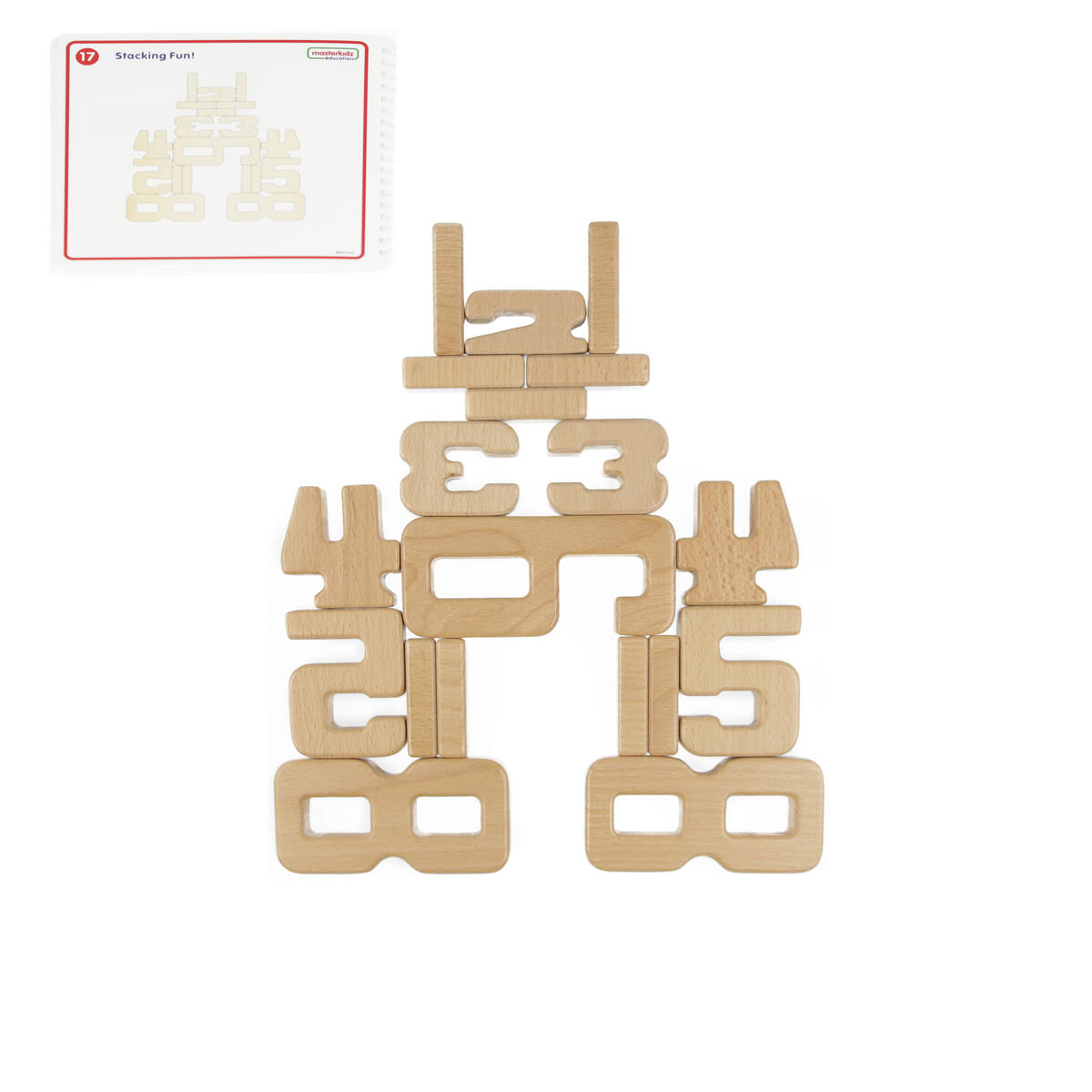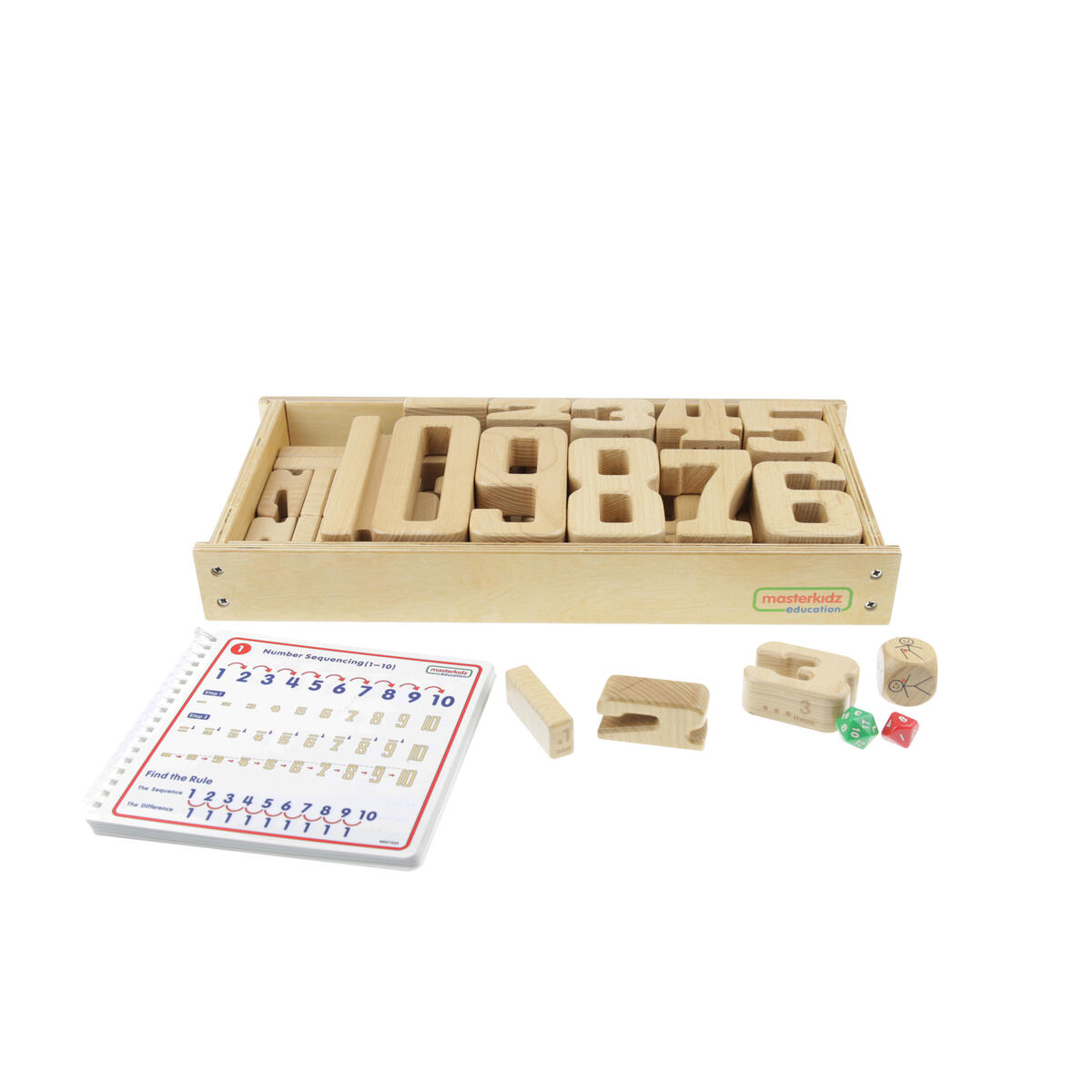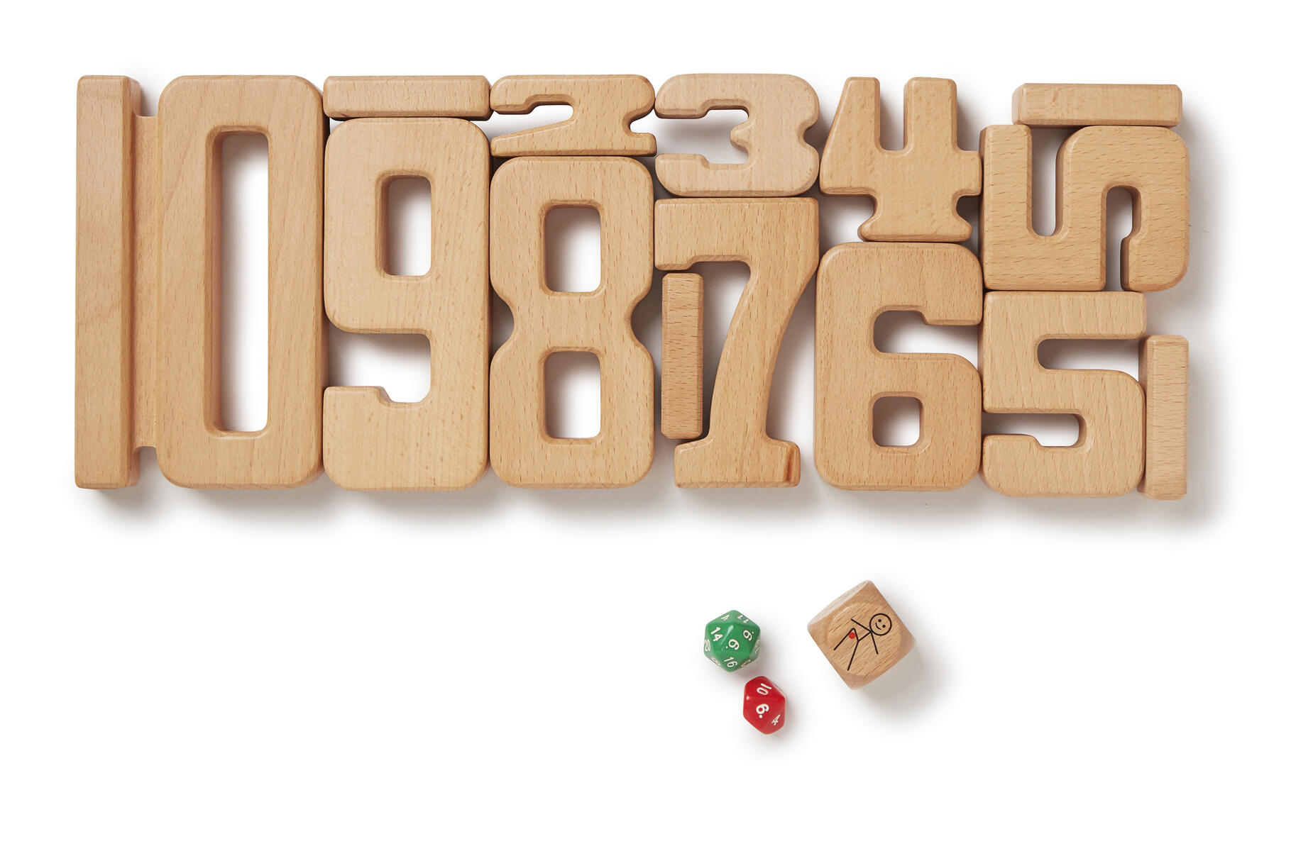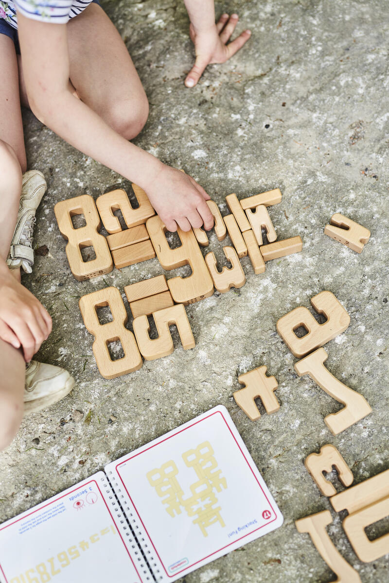 35 delar. Klossar av trä som utvecklar matematiska förmågor. Satsen innehåller siffrorna 1–10. Höjden på varje siffra står i proportion till respektive antal kvantiteter, t.ex. är höjden på nummer 5 lika med höjden av 3 och 2 staplade på varandra. Detta ger både taktila och visuella upplevelser. Av FSC-märkt bokträ. Levereras i praktisk förvaringslåda av trä. PVC-fri. Från 3 år.