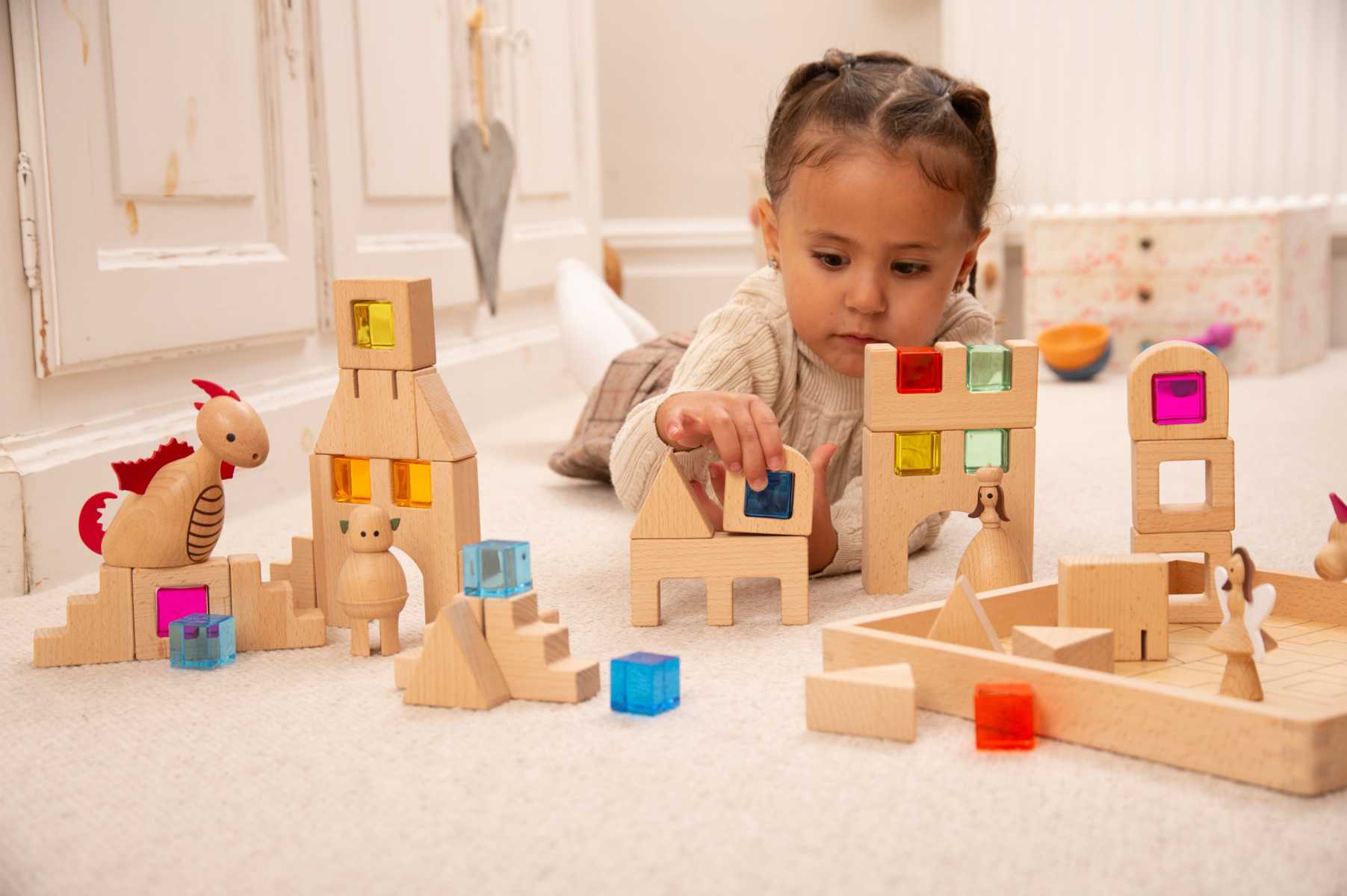 40 delar. Släta byggklossar i trä med kristallklara färgglada ädelstenskuber, förpackade på en robust förvaringsbricka i trä. Klossarna är öppna och varierade i stil för att uppmuntra kreativt byggande för äldre barn och enkel stapling för yngre barn. Tränar bl.a. färg, motorik, form och rymd. Mått: 27x27x 3 cm. Av FSC-märkt trä. PVC-fri. Från 3 år.