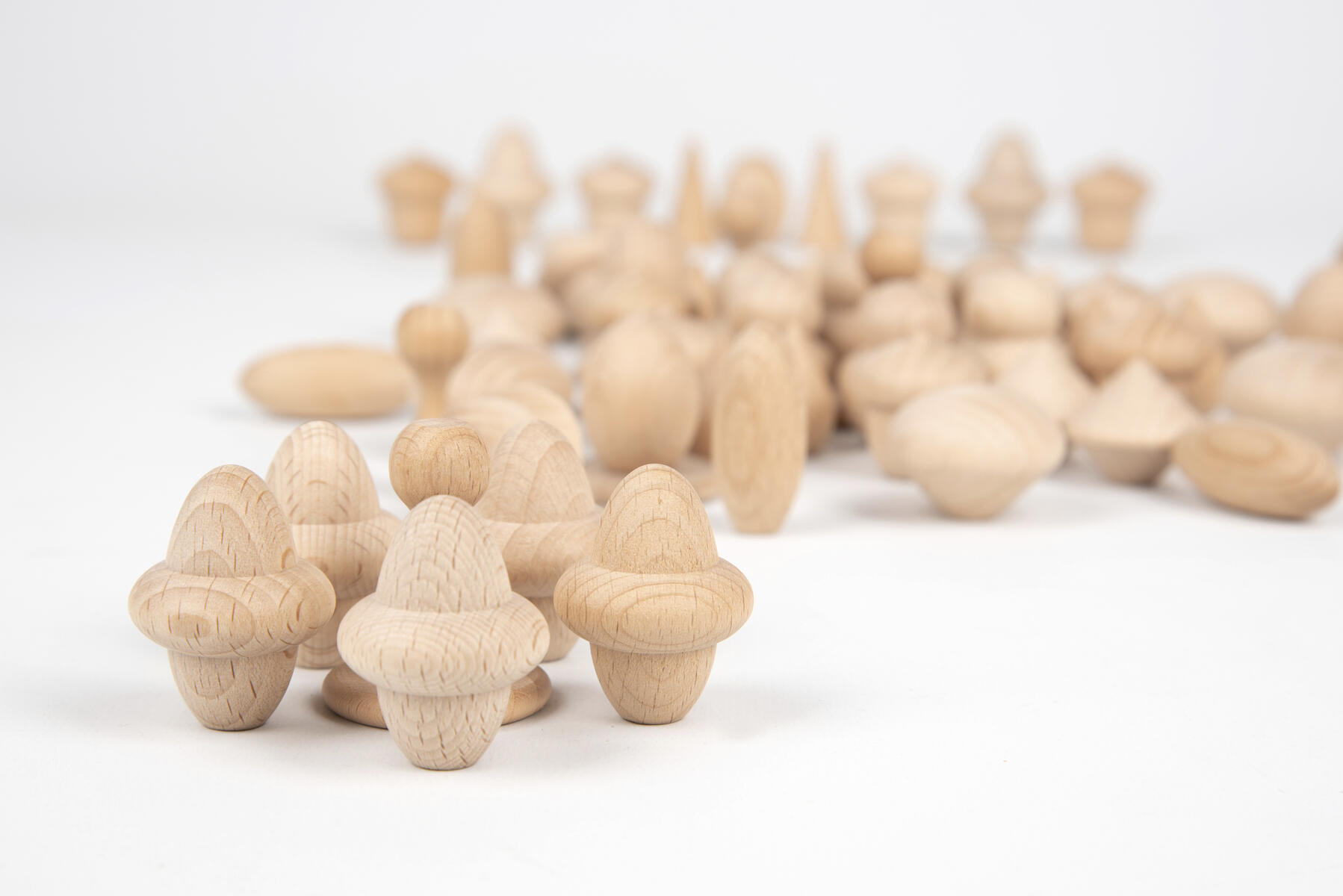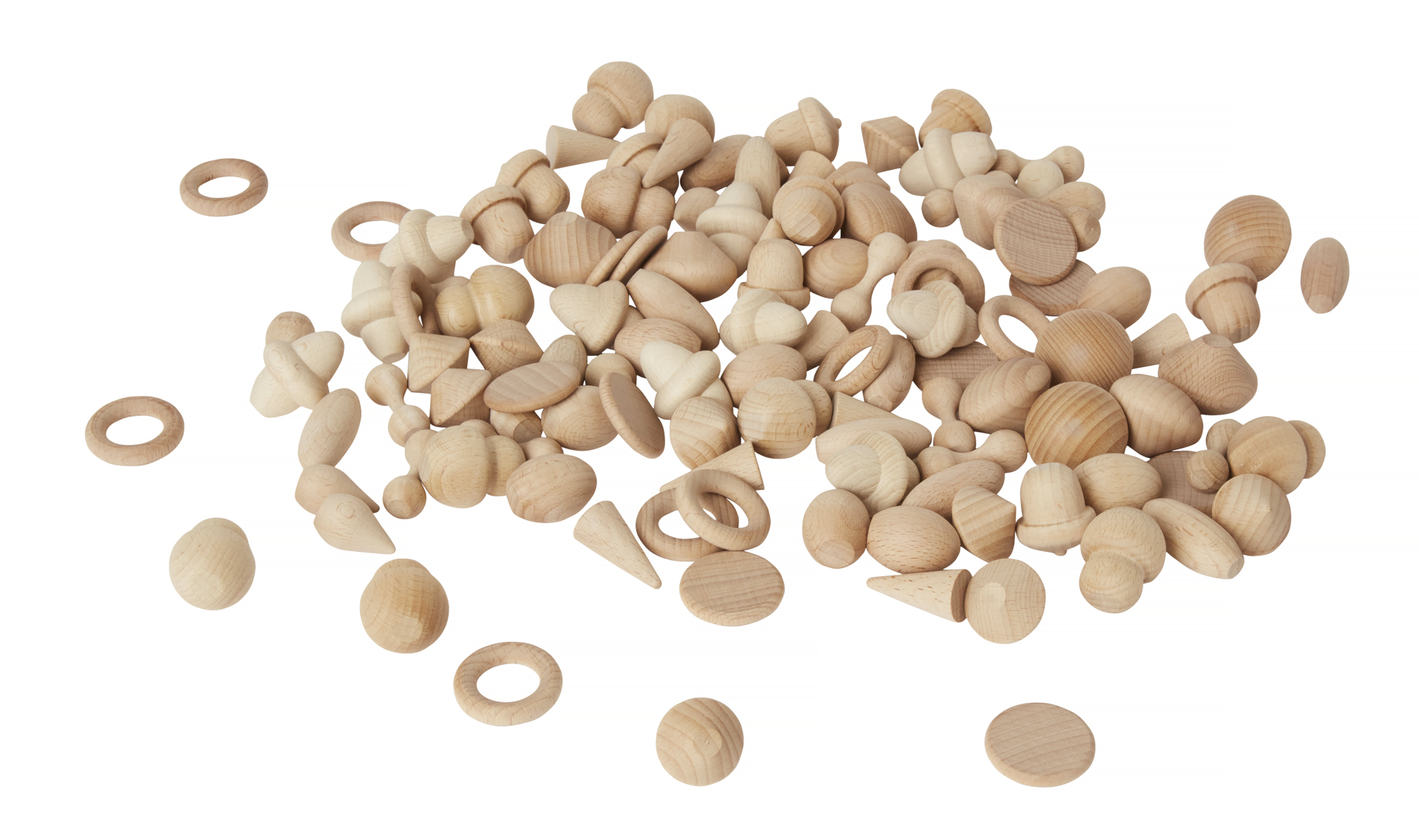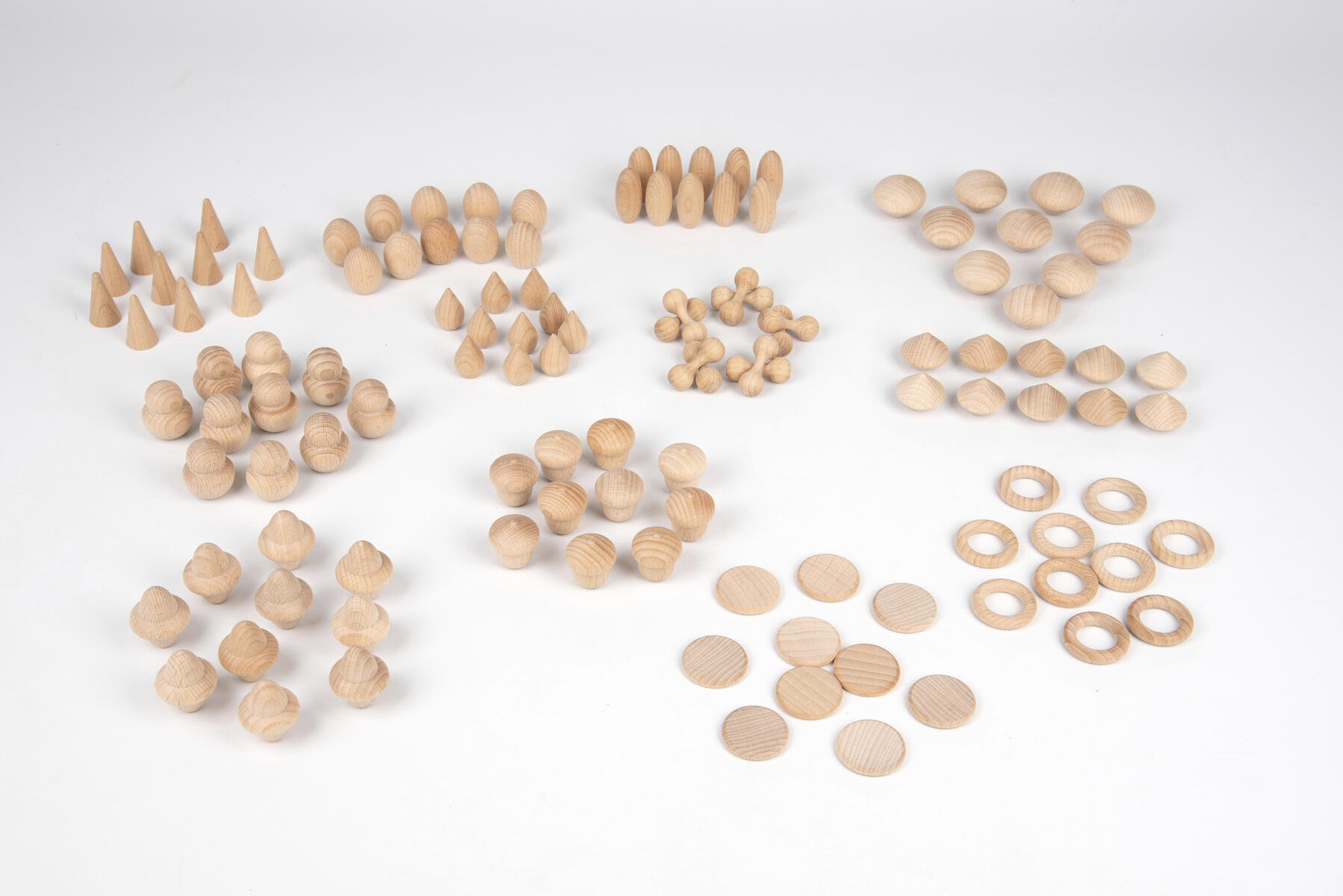120 delar. En uppsättning vackra släta ofärgade träformer inspirerade av naturen. Öva på att räkna, sortera och designa mönster eller använd som ett komplement i byggleken. Innehåll: 10 st x 12 olika former. Setet inkluderar en bomullspåse för enkel förvaring. Storlek per form: 35-40 mm. Av FSC-märkt trä. PVC-fri. Från 3 år.