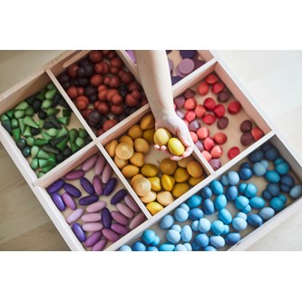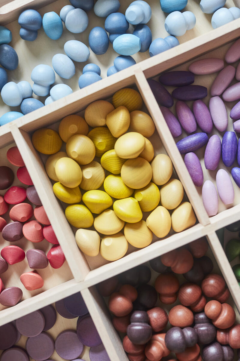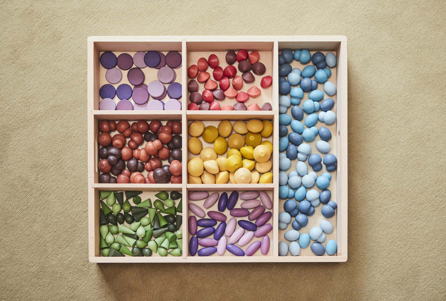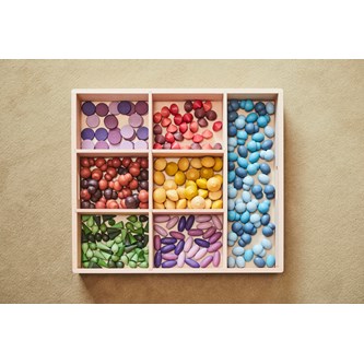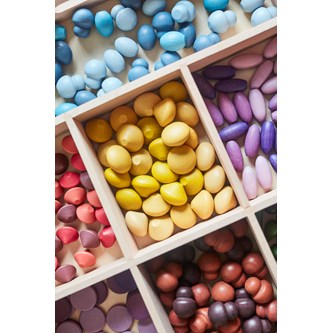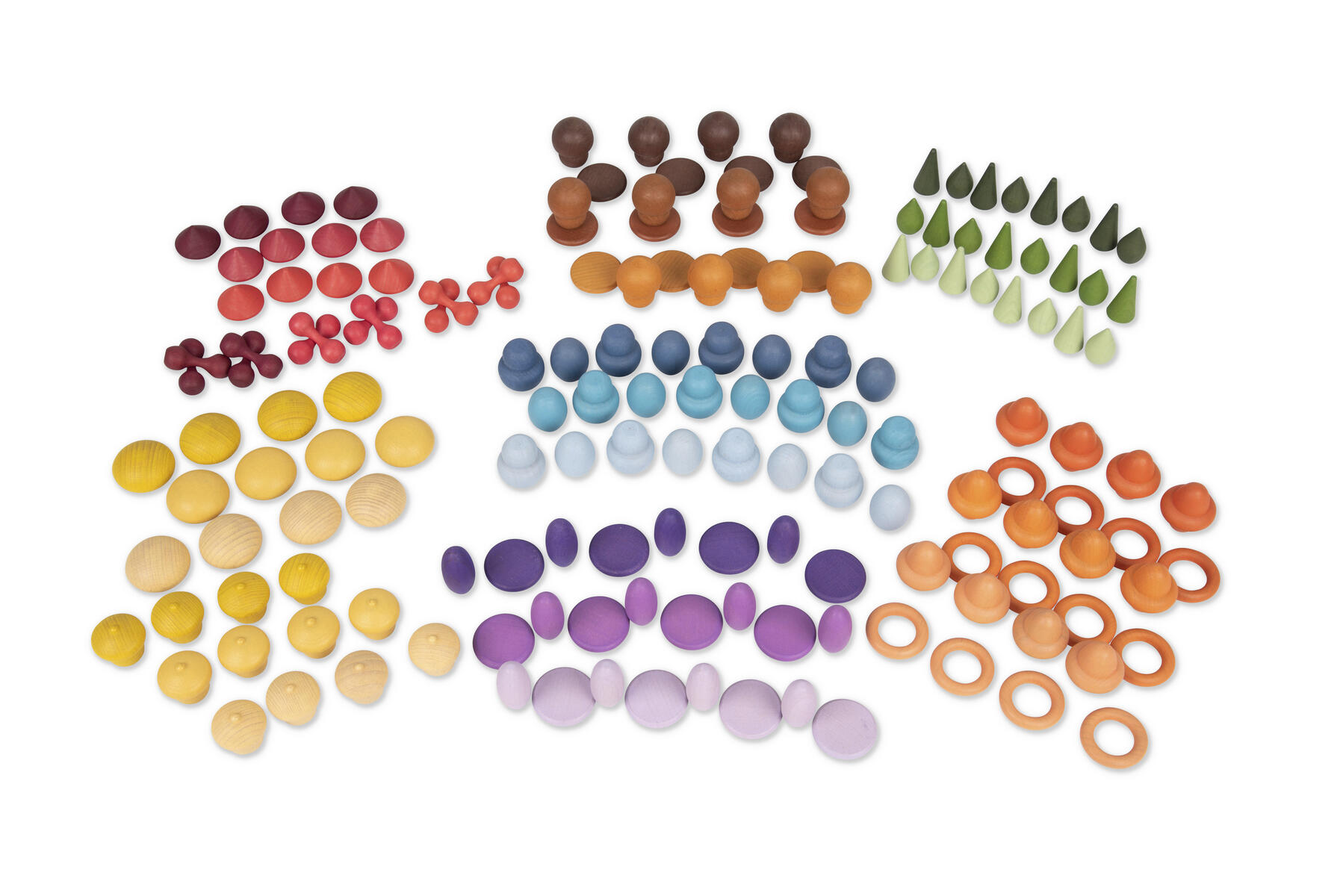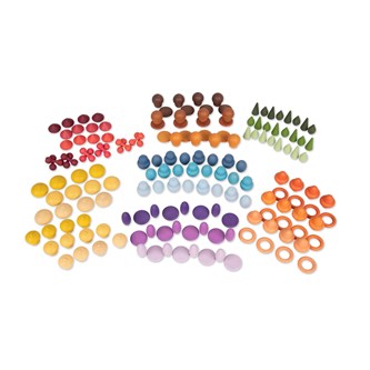 420 delar. En generös uppsättning släta träformer inspirerade av naturen. Varje form finns i flera nyanser av 7 färger. Öva på att räkna, sortera och designa mönster eller använd som ett komplement i byggleken. Innehåll: 30 st x 14 olika former (10 i varje färgnyans). Setet inkluderar en bomullspåse för enkel förvaring. Storlek per form: 35-40 mm. PVC-fri. Från 3 år.