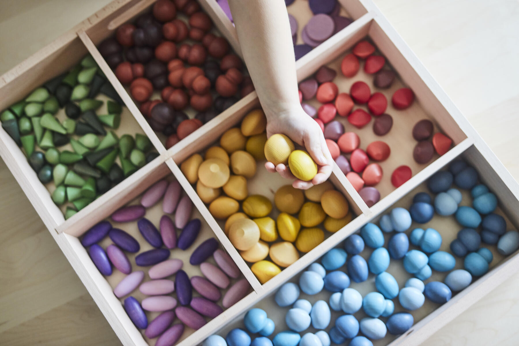 Sorteringsbricka i massivt bokträ, uppdelad i 7 sektioner. Brickan kan placeras plant eller stå upprätt. Perfekt för att sortera eller klassificera mindre föremål efter färg och form. Mått: 50x43x7 cm. Av FSC-märkt trä. PVC-fri. Från 10 månader.