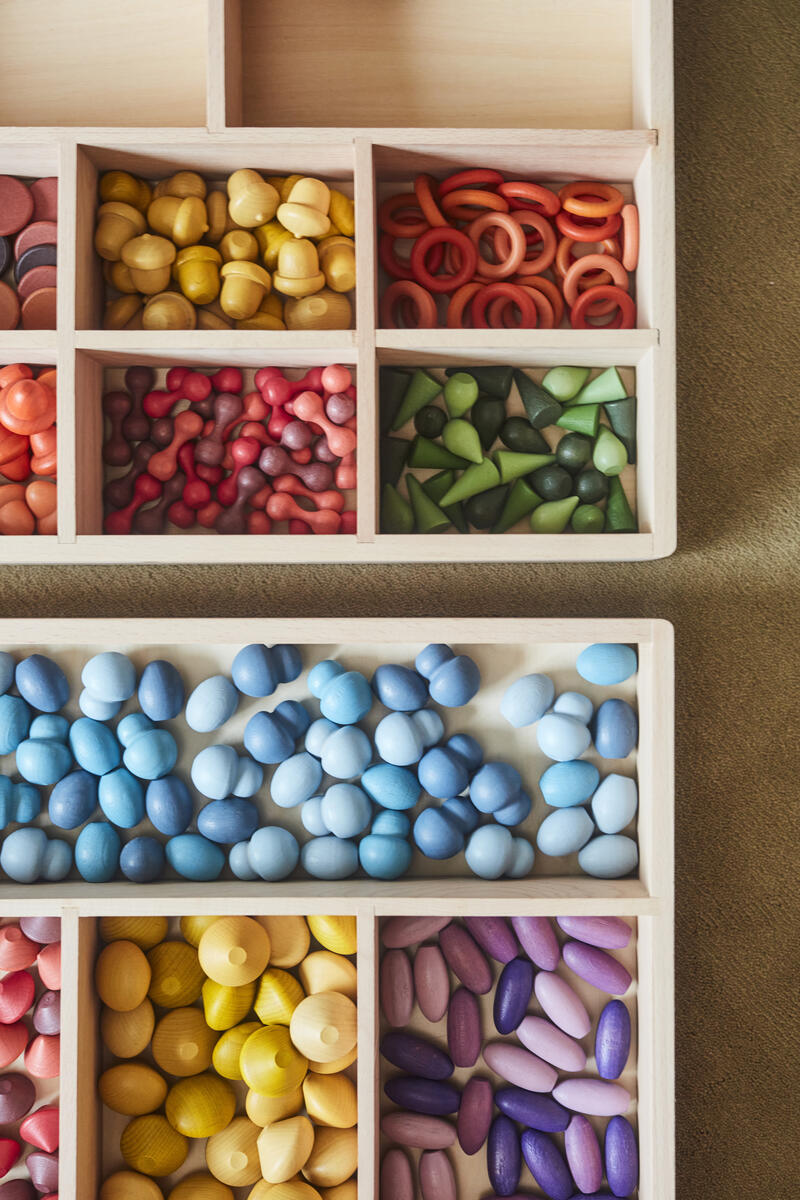 168 delar. En uppsättning vackra släta träformer inspirerade av naturen. Varje form finns i flera nyanser av 7 färger. Öva på att räkna, sortera och designa mönster eller använd som ett komplement i byggleken. Innehåll: 12 st x 14 olika former (4 st i varje färgnyans). Setet inkluderar en bomullspåse för enkel förvaring. Storlek per form: 35-40 mm. PVC-fri. Från 3 år.