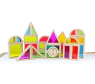 Klossar med rundade hörn och färgglada transparenta insatser. Genom att kombinera klossarna på olika sätt skapas förändringar i färger och mönster. Klossarna kan även användas för färgblandning på ljusbord. Innehåller klossar i olika former. FSC-märkt bokträ. PVC-fri. Från 3 år.