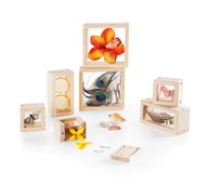 Klossar som kan öppnas och fyllas med mindre föremål för att ge olika sensoriska effekter. Klossarna har en rejäl ram av trä och fönster av akrylplast. Genom att lossa 2 skruvar kan man enkelt byta innehåll i klossen. Mått på största klossen 14x14 cm. PVC-fri. Från 3 år.