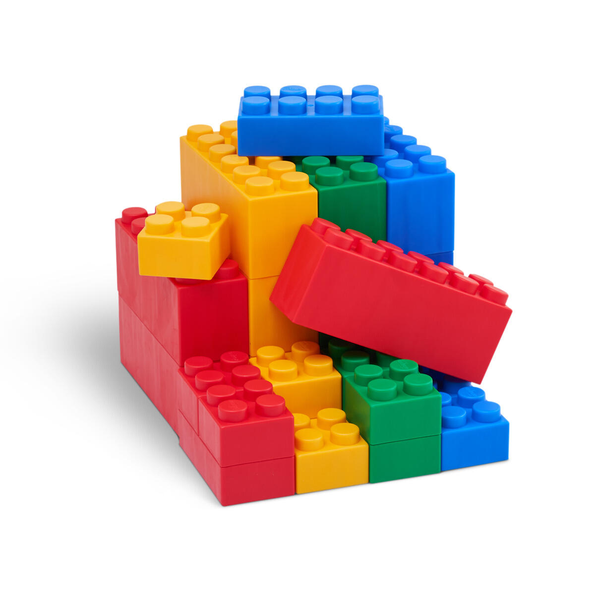 96 delar/fp. Stora, tysta byggklossar i glada färger. De 3 olika formerna har låg vikt och är enkla att bygga med. Mått: stor kloss 21x7x9 cm x48st, mellan kloss 14x7x5 cm x16 st och liten kloss 7x7x5 cm x32 st. Av PP och TPR. PVC-fri. Från 3 månader.