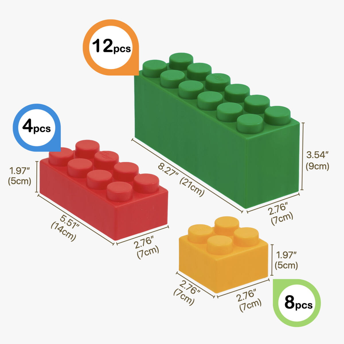 24 delar/fp. Stora, tysta byggklossar i glada färger. De 3 olika formerna har låg vikt och är enkla att bygga med. Mått: stor kloss 21x7x9 cm (12 st), mellankloss 14x7x5 cm (4 st) och liten kloss 7x7x5 cm (8 st). Av PP och TPR. PVC-fri. Från 3 månader.