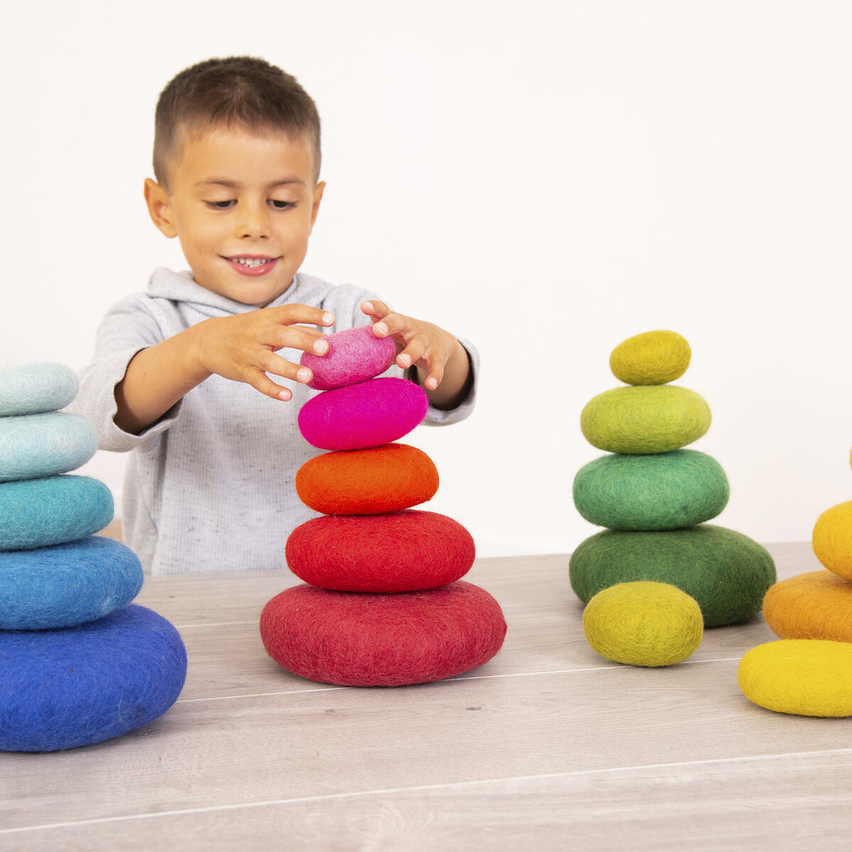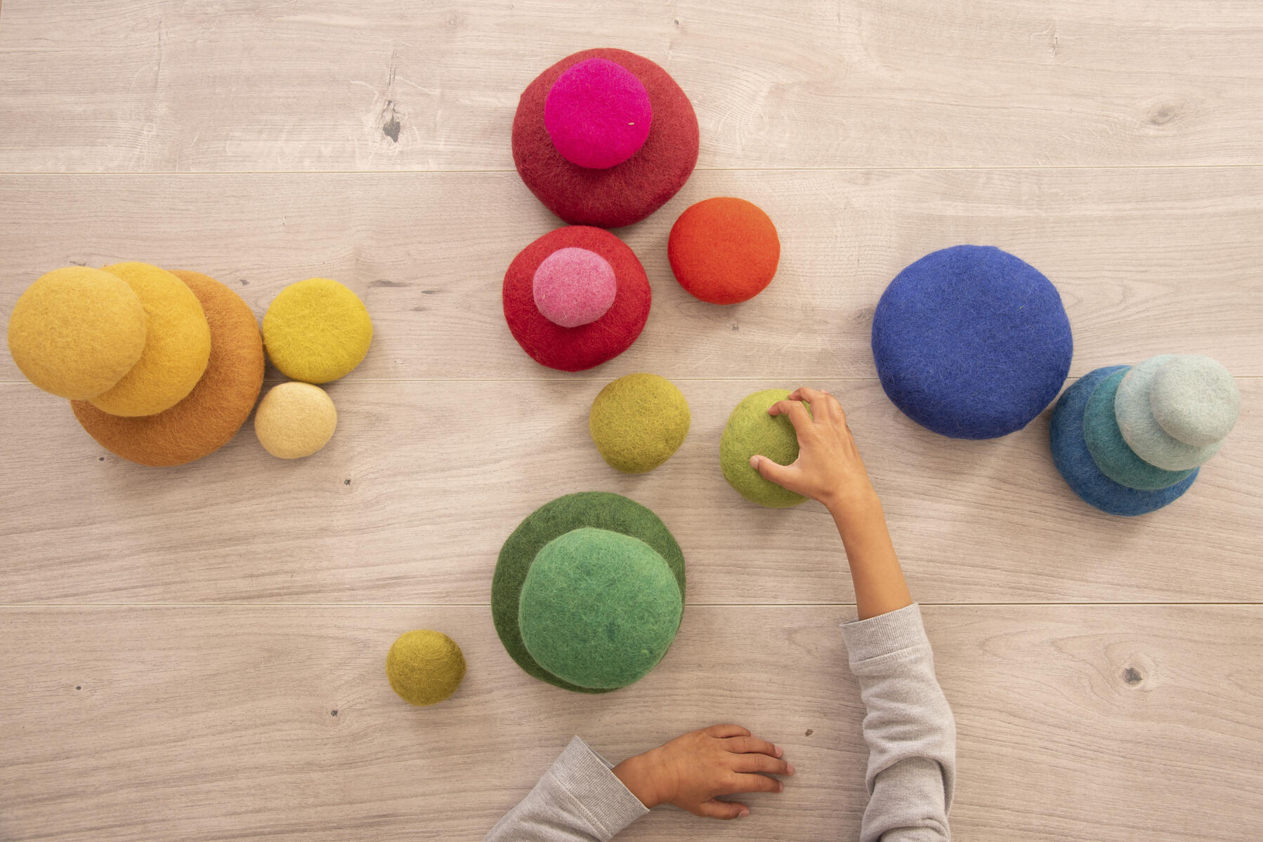5 st/fp. Filtstenar i olika storlekar och färgtoner för stapling, sortering eller klassificering. Minsta stenen är ø 7 cm och största är ø 16 cm. PVC-fri. Från 10 månader.