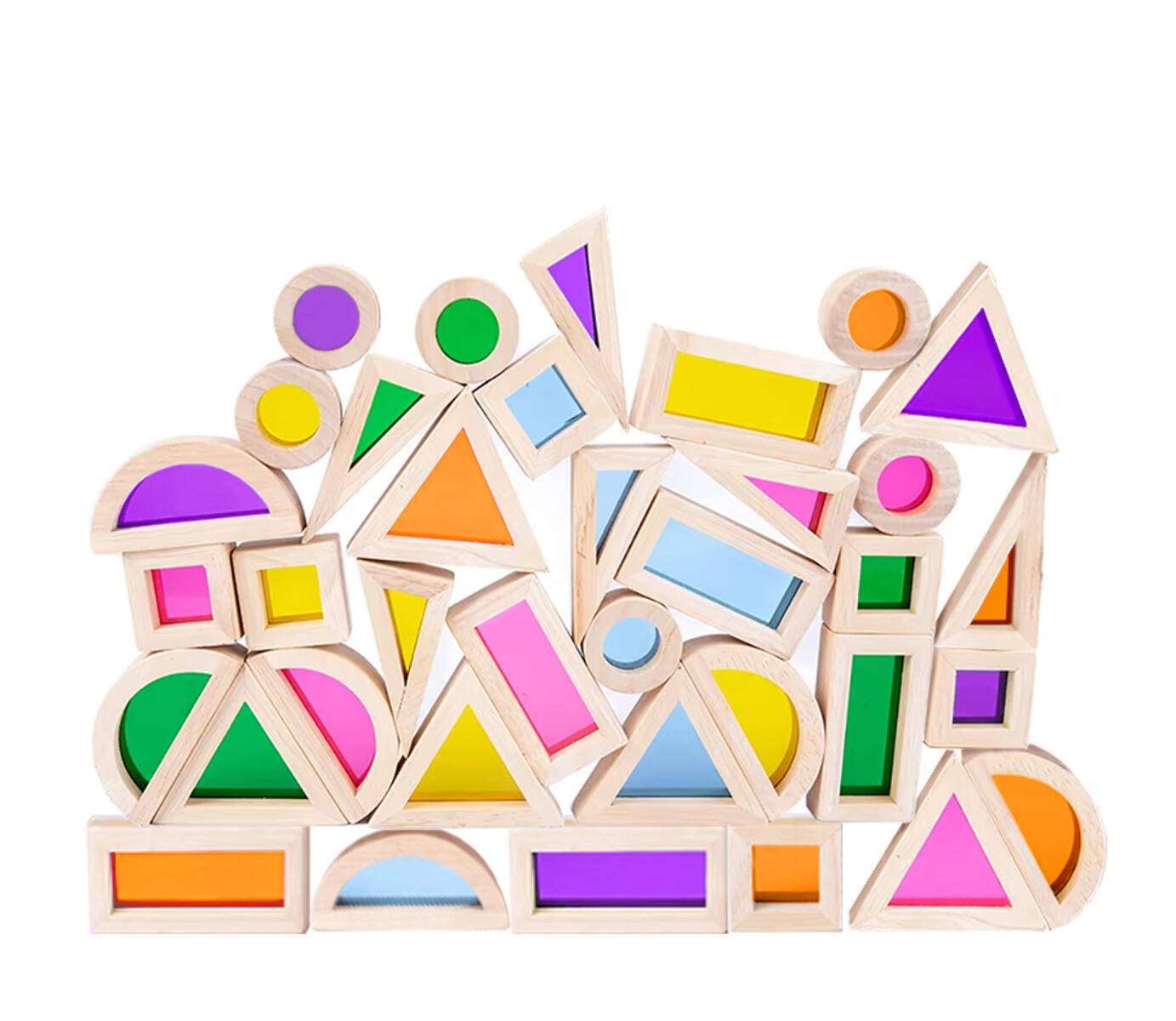 36 st/fp. Set med hårda block i 6 former och 6 olika transparenta färgade akrylinsatser för att bygga och jämföra, formigenkänning, färgblandning och användning på ljusbord. Mått rektangel: 10x5x2,5 cm. Av FSC-märkt trä och akrylplast. PVC-fri. Från 1 år.