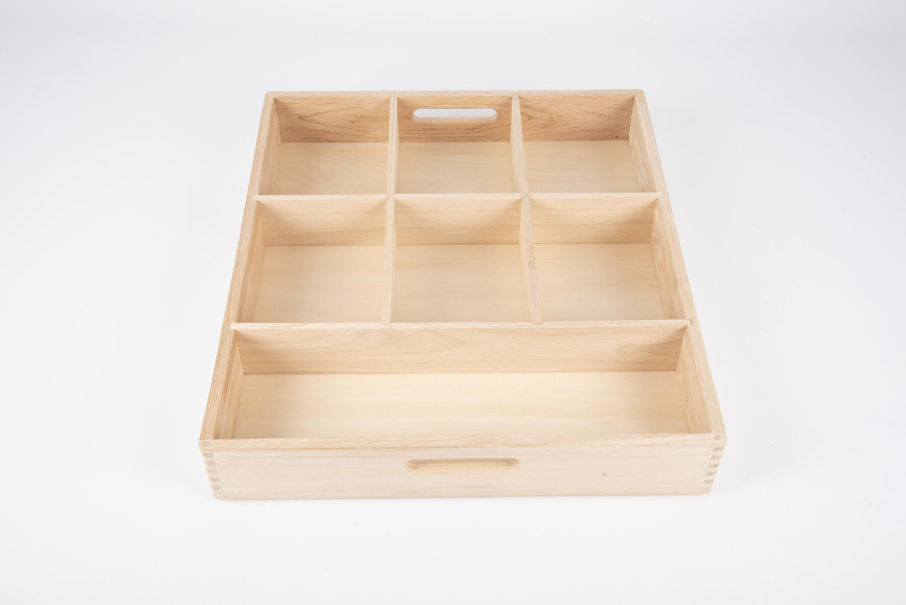 Sorteringsbricka i massivt bokträ, uppdelad i 14 sektioner. Brickan kan placeras plant eller stå upprätt. Perfekt för att sortera eller klassificera mindre föremål efter färg och form. Mått: 50x43x7 cm. Av FSC-märkt trä. PVC-fri. Från 10 månader.