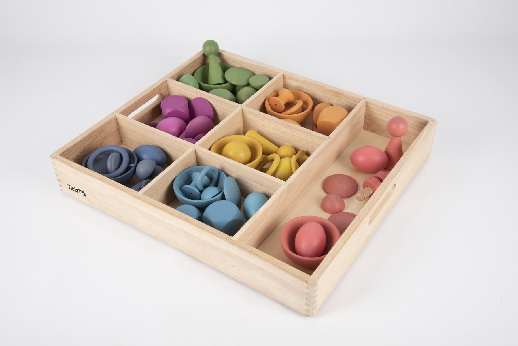 84 delar delar. Vackra träbitar i bokträ i regnbågens sju färger, med en naturlig finish för att visa träet. Idealisk för att skapa fantasifyllda scener, uppmuntra konstruktionsförmågan, räkna och sortera, stapla och lära sig mer om färg. Innehåller 84 träbitar, 7 i varje form och storlek. Av FSC-märkt trä. PVC-fri. Från 10 månader.