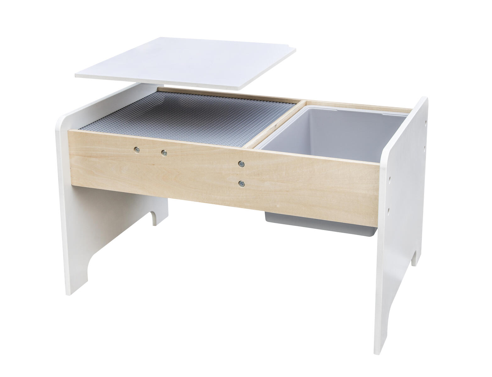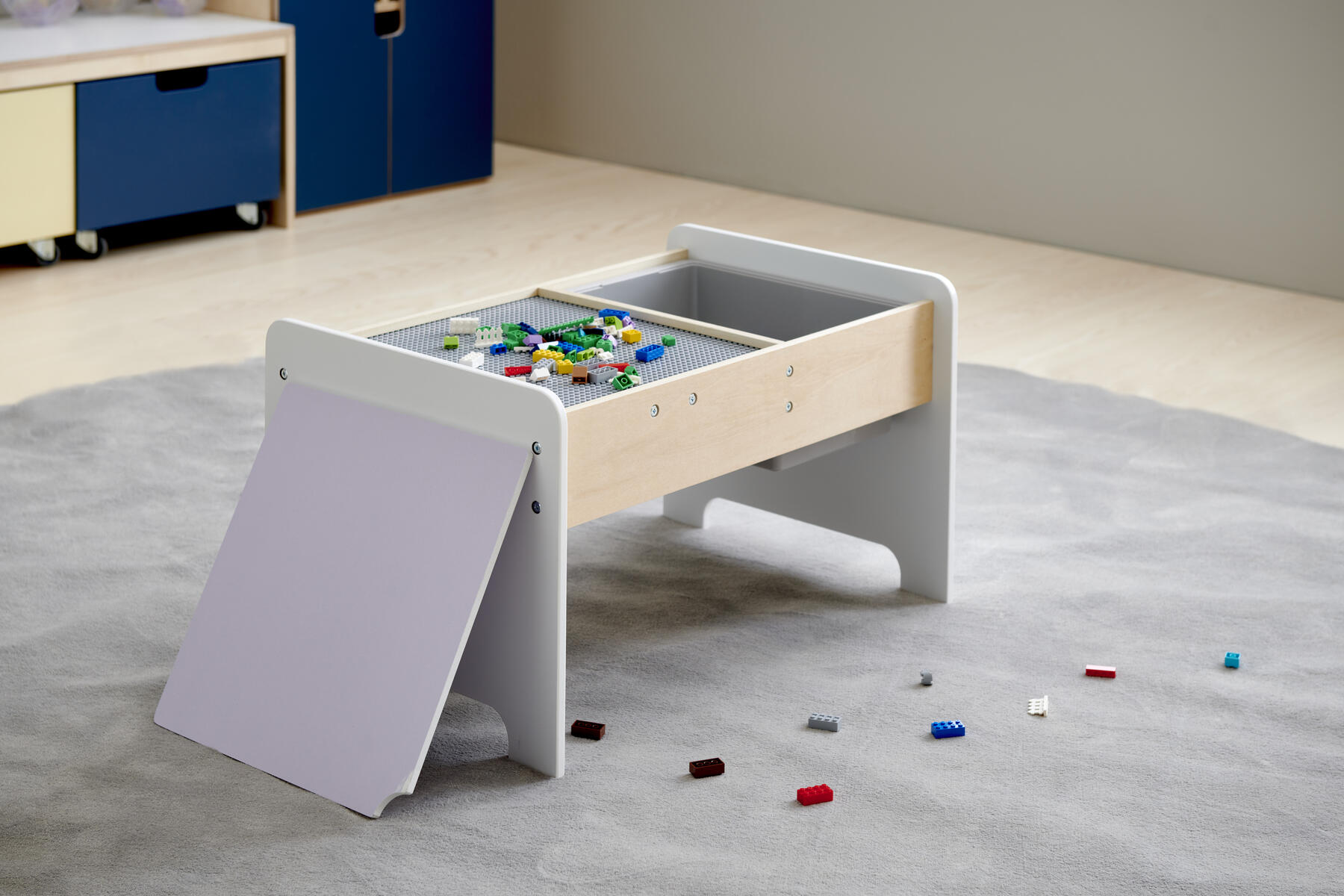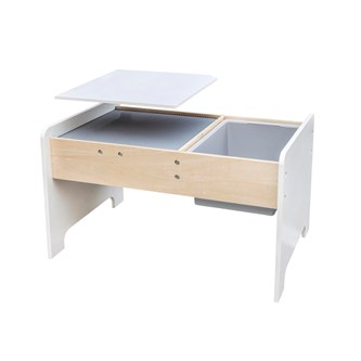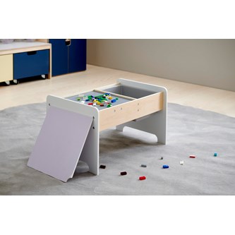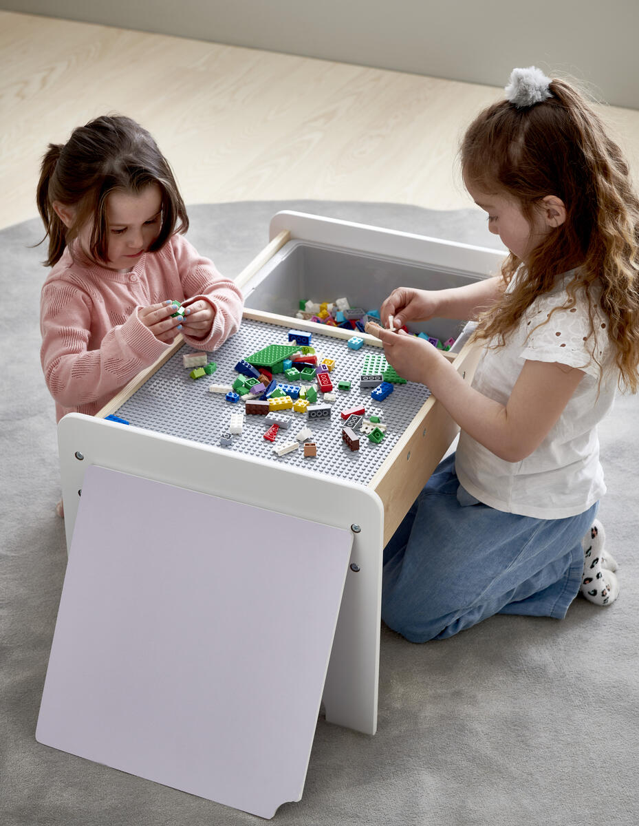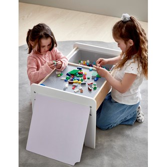 Ett praktiskt lekbord i FSC-märkt trä med inbyggd legoskiva, perfekt för legokonstruktioner. Det har en förvaringslåda som enkelt kan tas bort och en extra skiva som kan läggas över legoskivan när bordet används för annan kreativ lek. Underredets mått: L45xB67xH39 cm. Levereras omonterat. PVC-fri. Från 3 år.