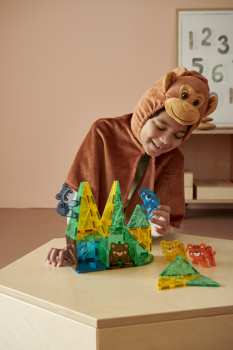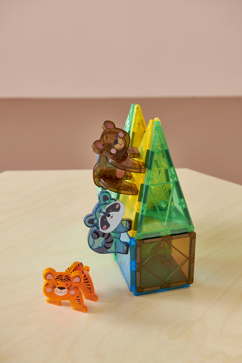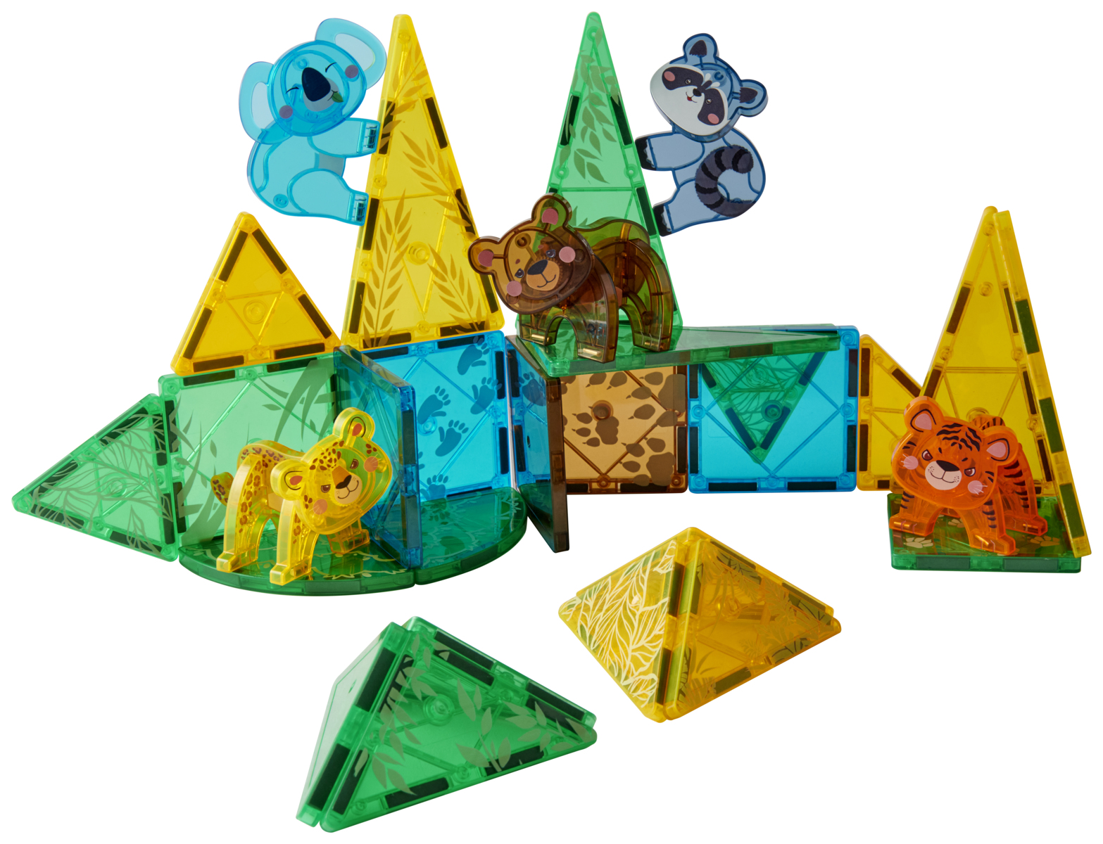 38 delar. Magnetiska byggplattor med djungeltema som främjar lek, kreativitet och lustfyllt lärande. Tränar finmotorik och rumsuppfattning samt utvecklar förmågan att känna igen symmetri. Setet inkluderar en koala, tiger, tvättbjörn, björn och leopard med rörliga leder. Byggbeskrivning medföljer. Av ABS. PVC-fri. Från 3 år.