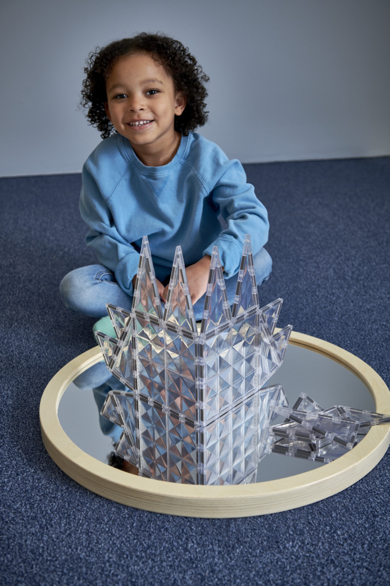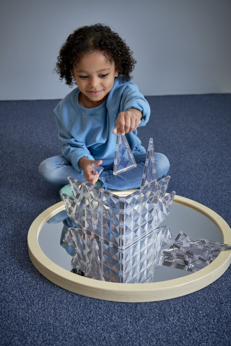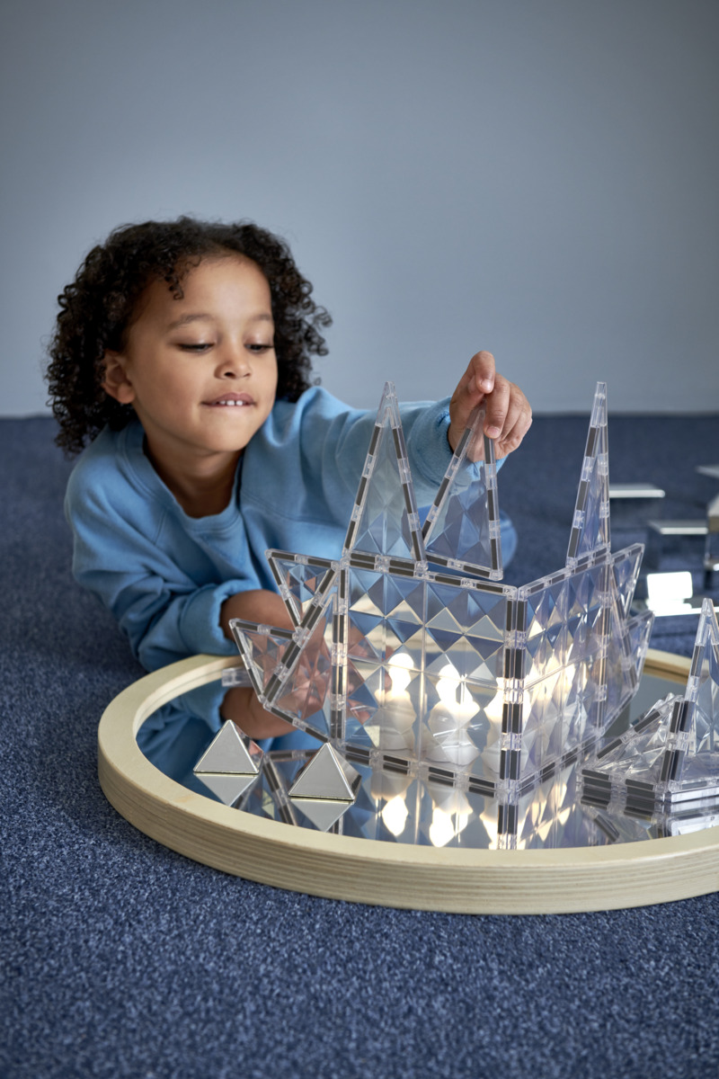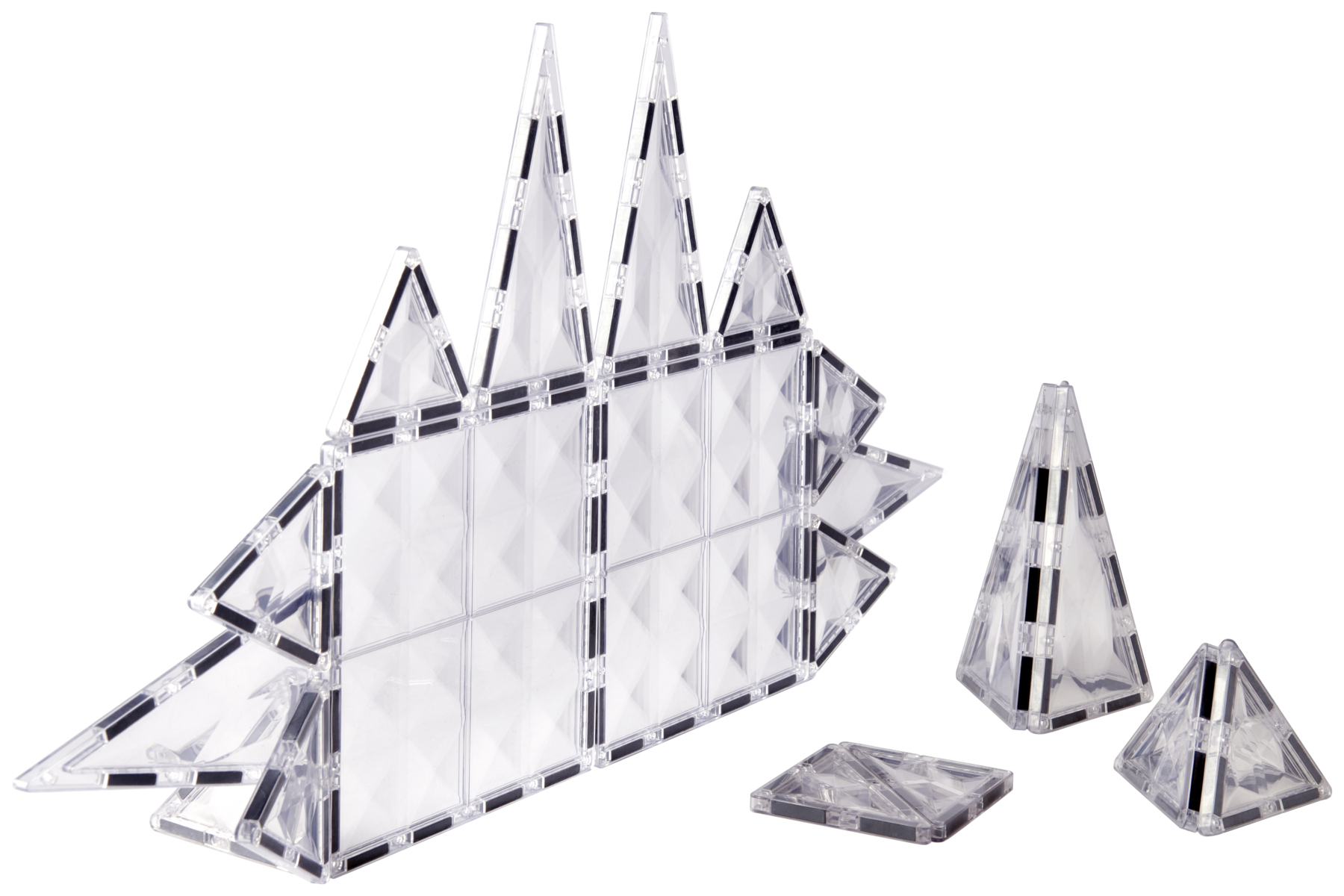 32 delar. Transparenta magnetiska byggplattor med diamantliknande prismamönster. Passar när fokus ska ligga på konstruktion och geometri snarare än färg. Kan även användas ihop med andra set för att skapa fönsterpartier. Magnetiska byggklossar utvecklar geometriskt tänkande, finmotorik och rumsuppfattning. Byggbeskrivning medföljer. Av ABS. PVC-fri. Från 3 år.