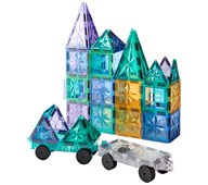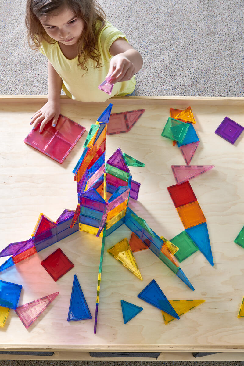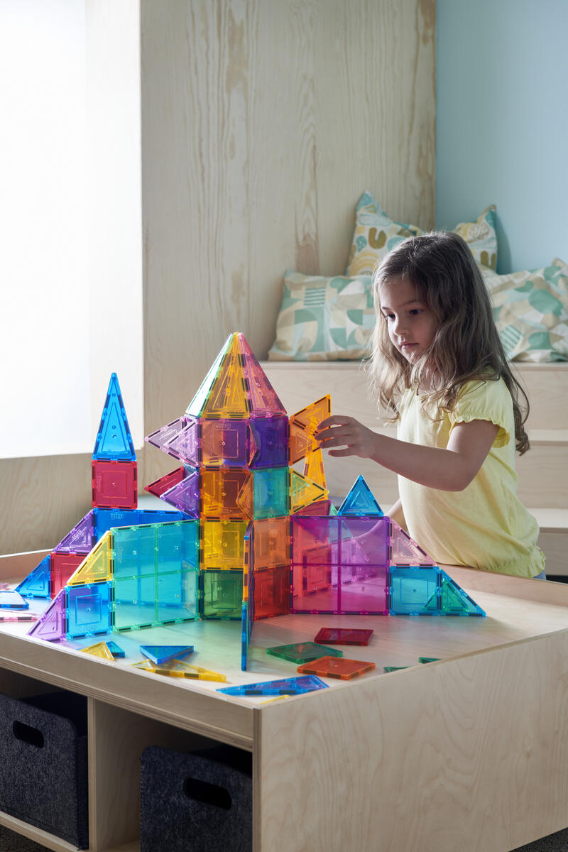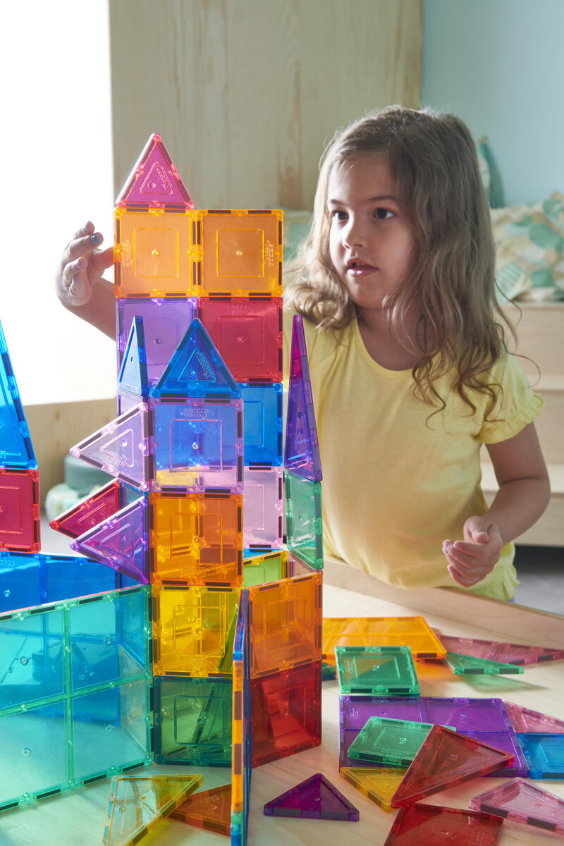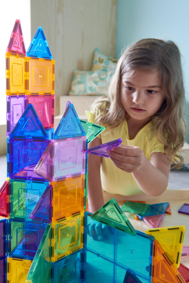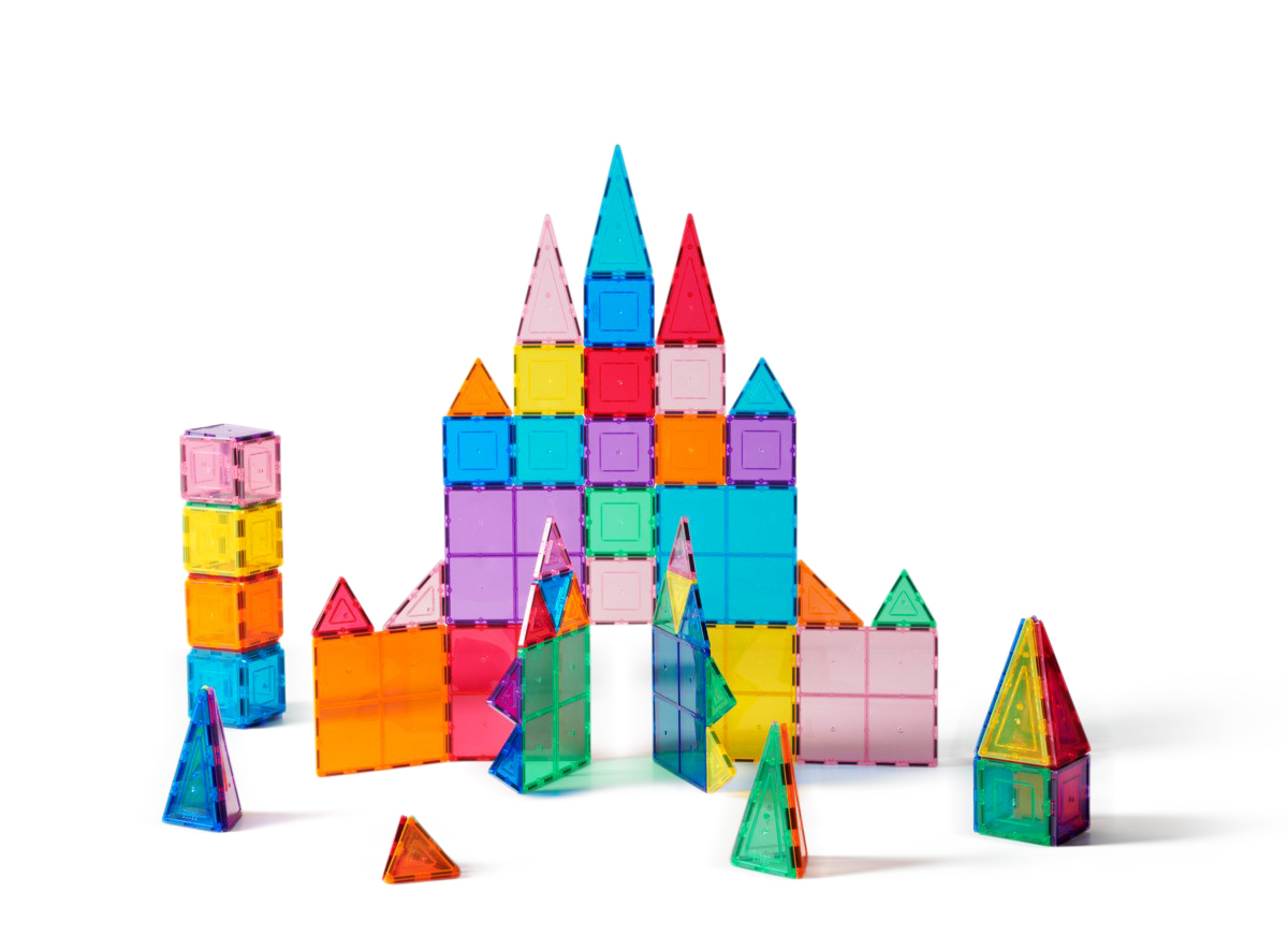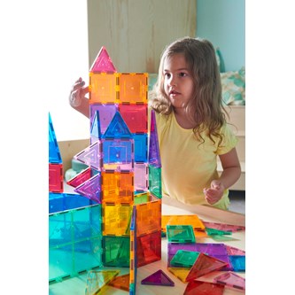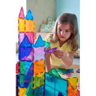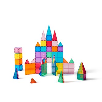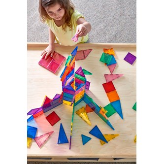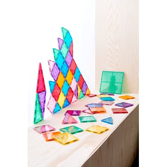 100 delar. Magnetiska brickor som inspirerar små händer att lustfyllt skapa och konstruera i 3D. De magnetiska bitarna passar ihop från alla håll. Barnen kan bygga både smått och stort genom att enkelt lägga till fler och fler brickor. Genom leken utvecklar barnen olika förmågor som t.ex. igenkänning av former, finmotoriska färdigheter, mönster, matematik och rumslig medvetenhet. Innehåller tre olika trianglar och två olika kvadratiska former. Måttexempel på kvadrat: 7,5x7,5 cm eller 15x15 cm. Av ABS. PVC-fri. Från 3 år.