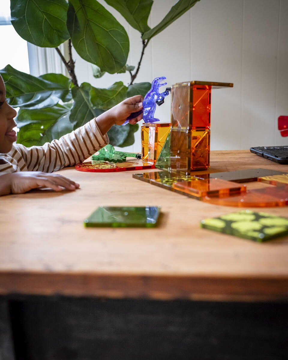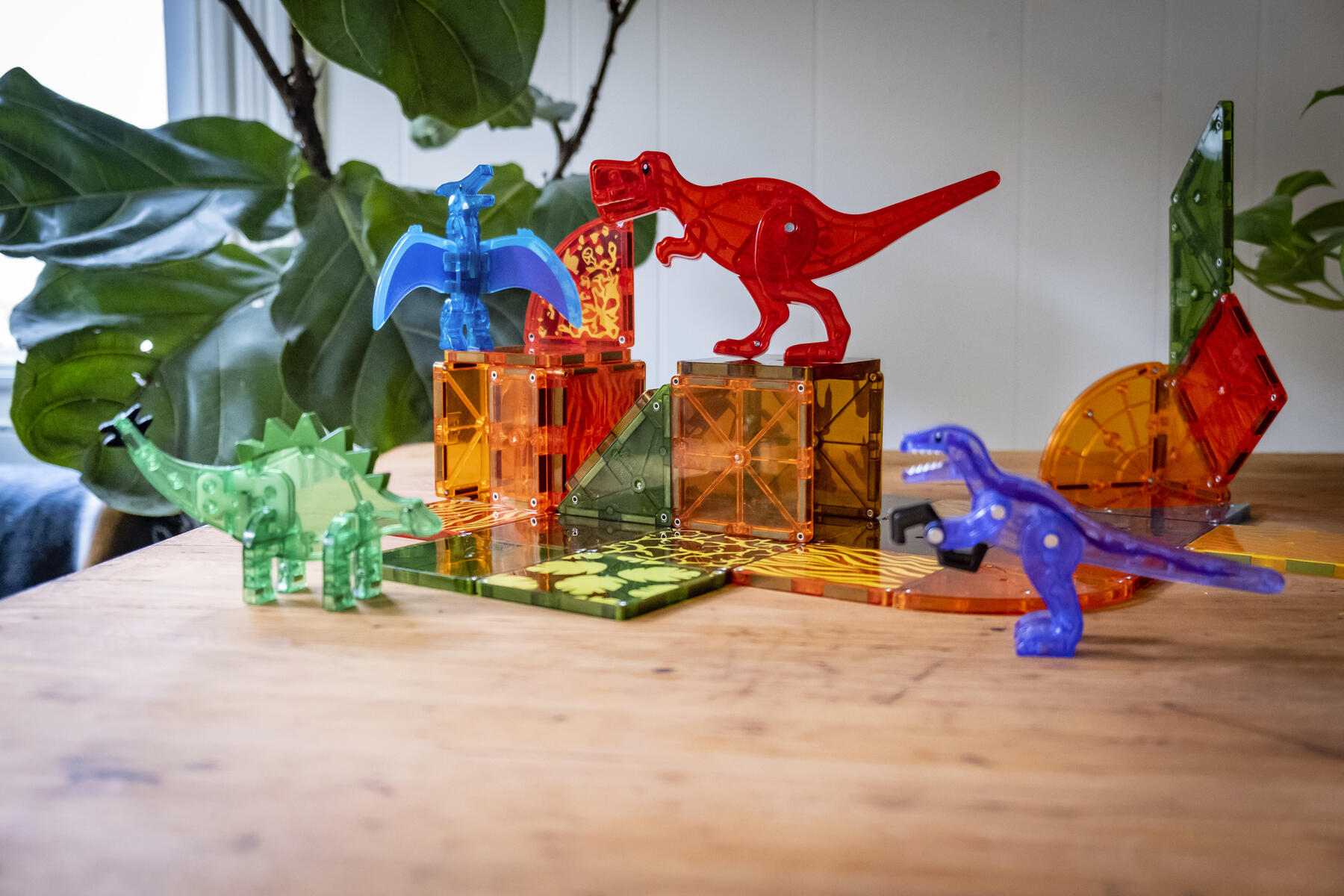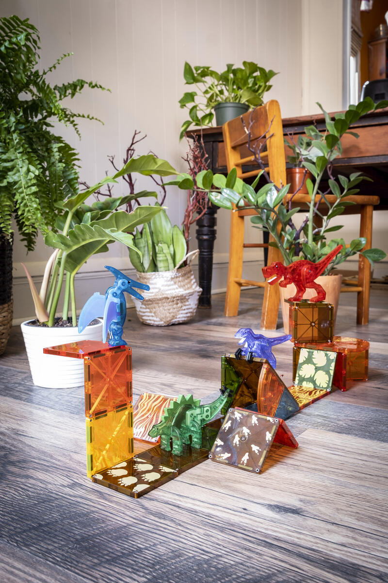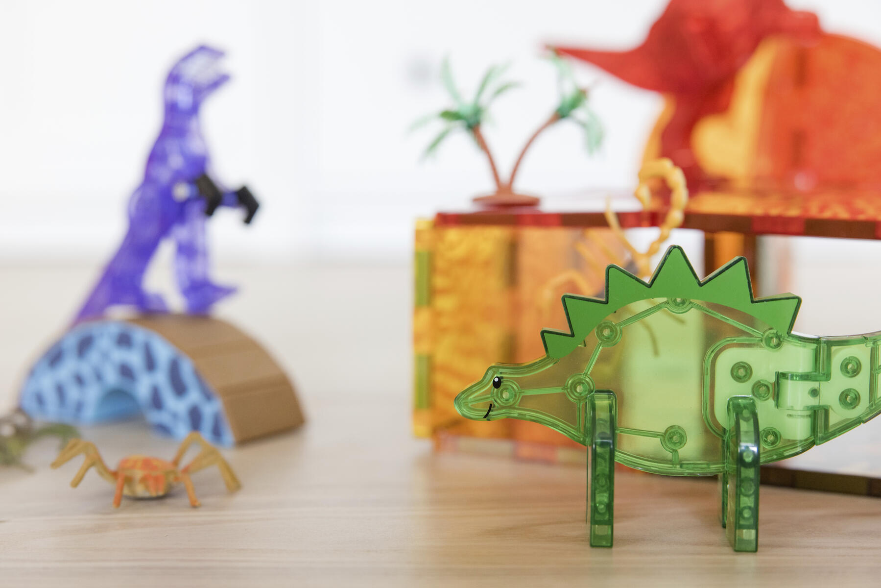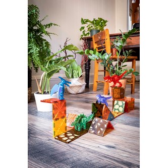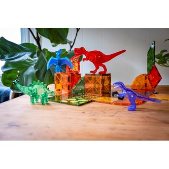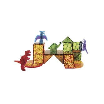 40 delar. Utforska den förhistoriska eran med detta roliga och spännande set. Innehåll: 24 små kvadrater, 6 räta trianglar, 1 rektangel, 1 liten rektangel, 4 kvartscirklar, 1 Velociraptor, 1 Stegosaurus, 1 Pteranodon och 1 Tyrannosaurus rex. Produkten är designad med barn i åtanke, med lätthanterliga och säkra magnetiska plattor som uppmuntrar förståelsen av geometriska begrepp. Den släta ytan på bitarna är designad för att motstå fläckar och repor. Av ABS. PVC-fri. Från 3 år.