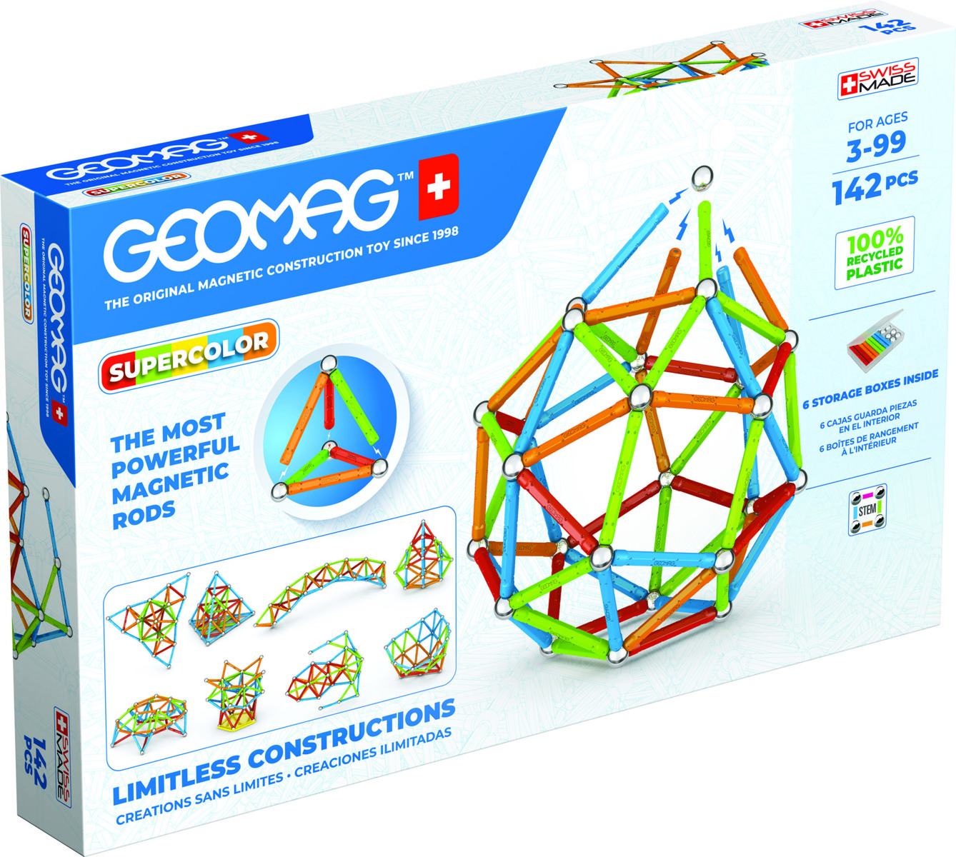 142 delar. Klassiskt magnetiskt konstruktionssystem med magnetiska stavar, paneler och baser gjorda av 100 % återvunnen PP- och ABS-plast. Geomags färgglada magnetstavar kan sättas ihop till en mängd olika strukturer och former. Från 3 år.
