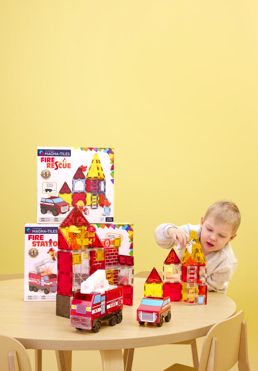 50 delar/fp. Stora och små, tre- och fyrkantiga magnetiska plattor som drar sig till varandra när barnen bygger. Detta stora set innehåller allt som behövs för att bygga din egen brandstation, inklusive brandman, hund och en brandbil med kran utrustad med ljud och ljus, där 2 x LR44 1,5 V-batterier ingår. Mått på figur: 7 cm. Av ABS. PVC-fri. Från 3 år.