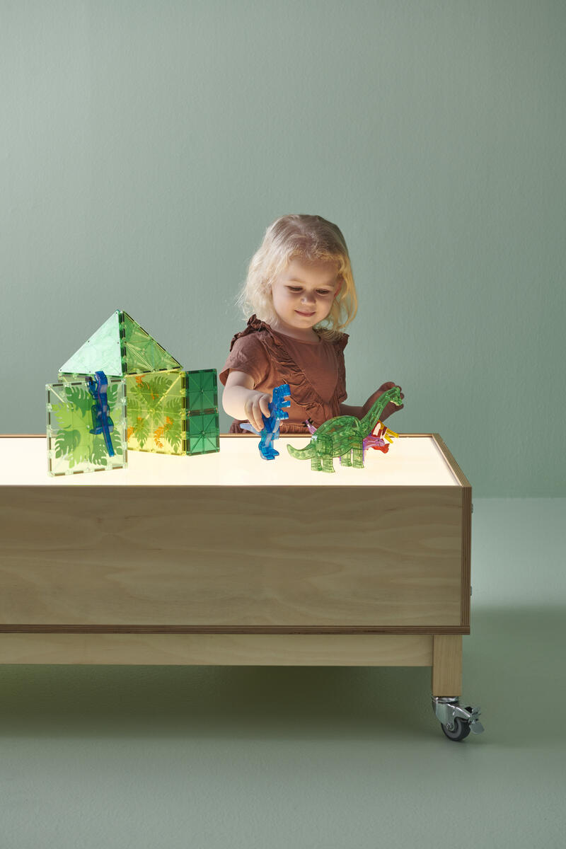 50 delar. Detta stora set med dinosaurietema består av 6 stora kvadrater, 6 stora räta trianglar, 4 stora liksidiga trianglar, 8 små kvadrater, 2 räta trianglar, 16 bladbitar, 2 trädstammar, 1 Velociraptor, 1 Triceratops. 1 Stegosaurus, 1 Pteranodon, 1 Tyrannosaurus rex och 1 Brachiosaurus. Produkten är designad med barn i åtanke, med lätthanterliga och säkra magnetiska plattor som uppmuntrar förståelsen av geometriska begrepp. Den släta ytan på bitarna är designad för att motstå fläckar och repor. Av ABS. PVC-fri. Från 3 år.