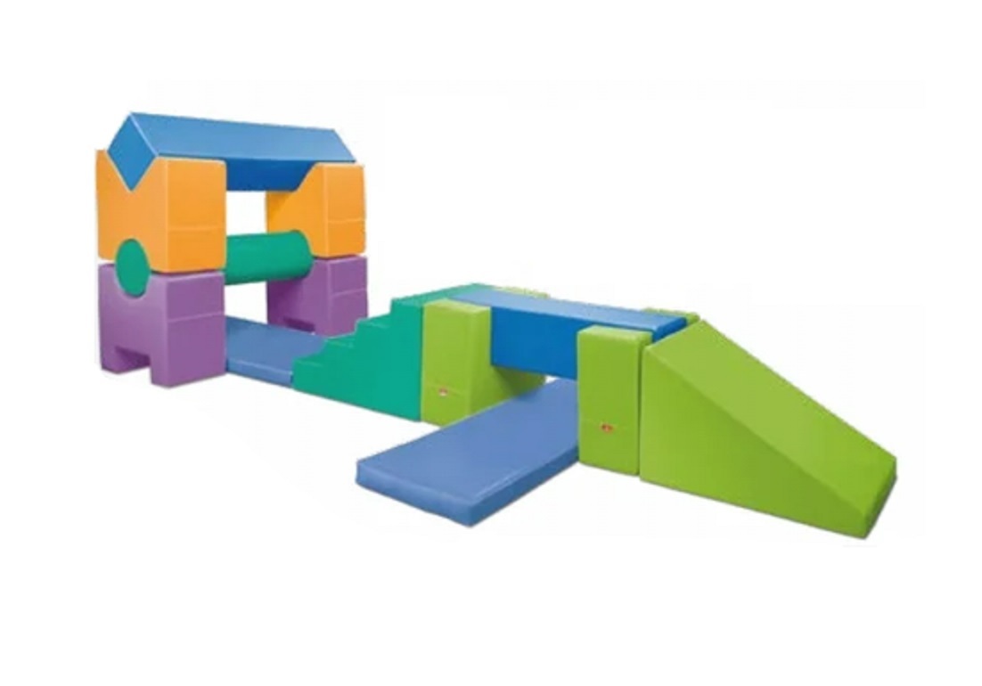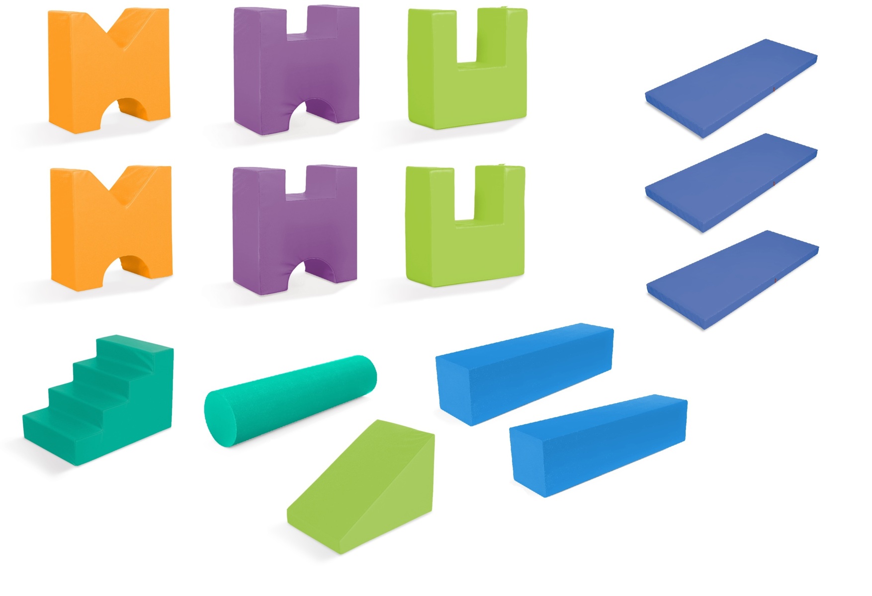 14 delar/set. Ett härligt set byggdelar i skum som bjuder in till mycket lek och aktivitet. Med lite fantasi verkar möjligheterna obegränsade för hur de olika formerna kan kombineras i olika konstruktioner. Måttexempel: Grön trappa: 90x60x60 cm, 6,50 kg. Blå bom: 120x30x30 cm, 3,5 kg. Av PVC, utan förbjudna ftalater.
