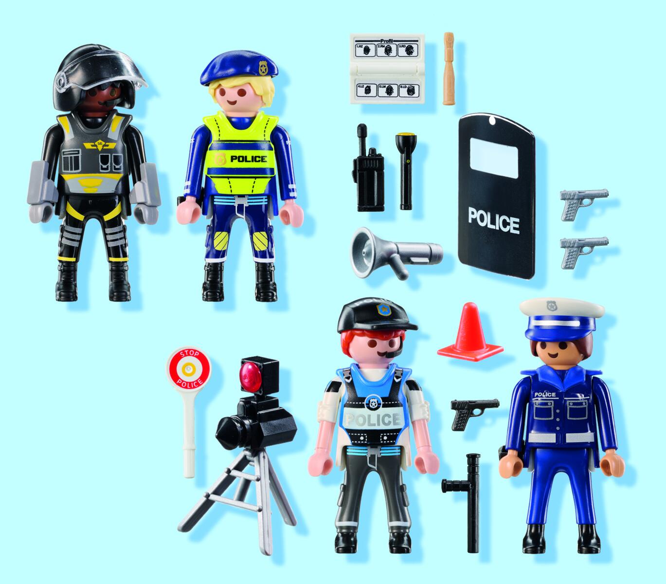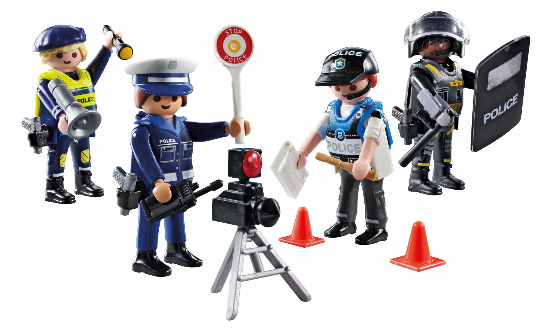 35 delar/fp. Med 4 polisfigurer och en mängd realistiska tillbehör som hölster, megafon, polissköld och en fartkamera, kan barnen skapa sina egna actionfyllda äventyr. Av ABS. PVC-fri. Från 4 år