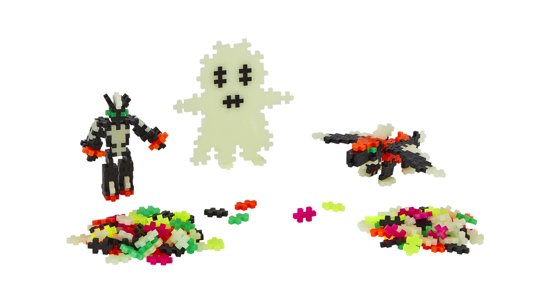 500 delar. Det här setet lär barnen hur man bygger enkla figurer som spöken och rymd-enhörningar. Självlysande bitar i blandade färger. Setet innehåller även 2 basplattor och en guidebok. Plus-Plus är ett fantastiskt sätt att förbättra barns kreativa tänkande, finmotorik och fantasi. Designat och tillverkat i Danmark. BPA-fritt och ftalatfritt. Av livsmedelsgodkänd PE. PVC-fri. Från 3 år.