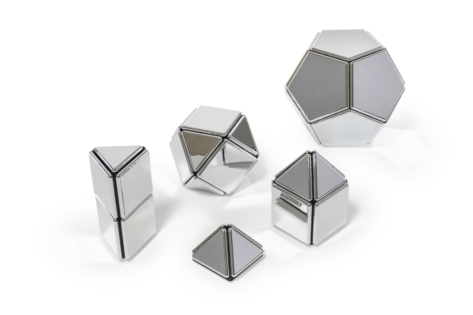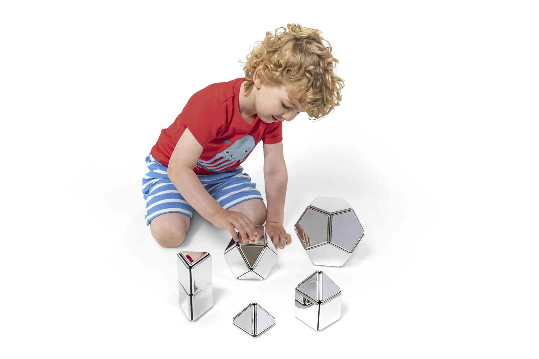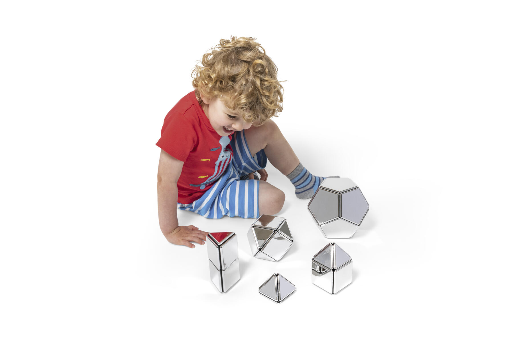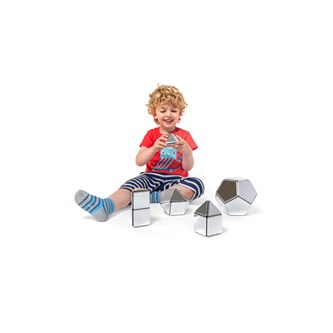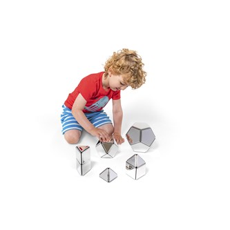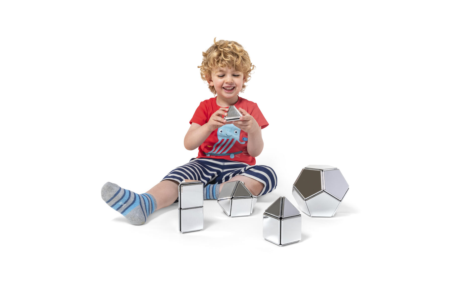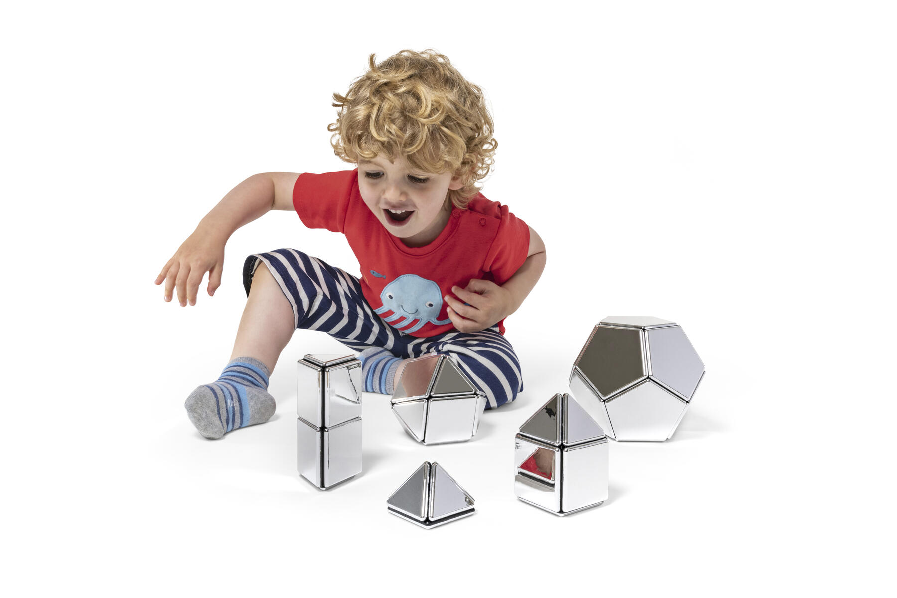 48 delar. Ta den magnetiska byggleken ett steg längre in i den sensoriska världen. Här kan barnen upptäcka reflektion och geometri i samma produkt. Innehåller 18 trianglar, 18 rutor och 12 pentagoner. Rengörs med alkoholbaserat desinfektionsmedel. Används fördel på mjuka underlag, då vassa föremål kan repa ytan. Av ABS. PVC-fri. Från 3 år.