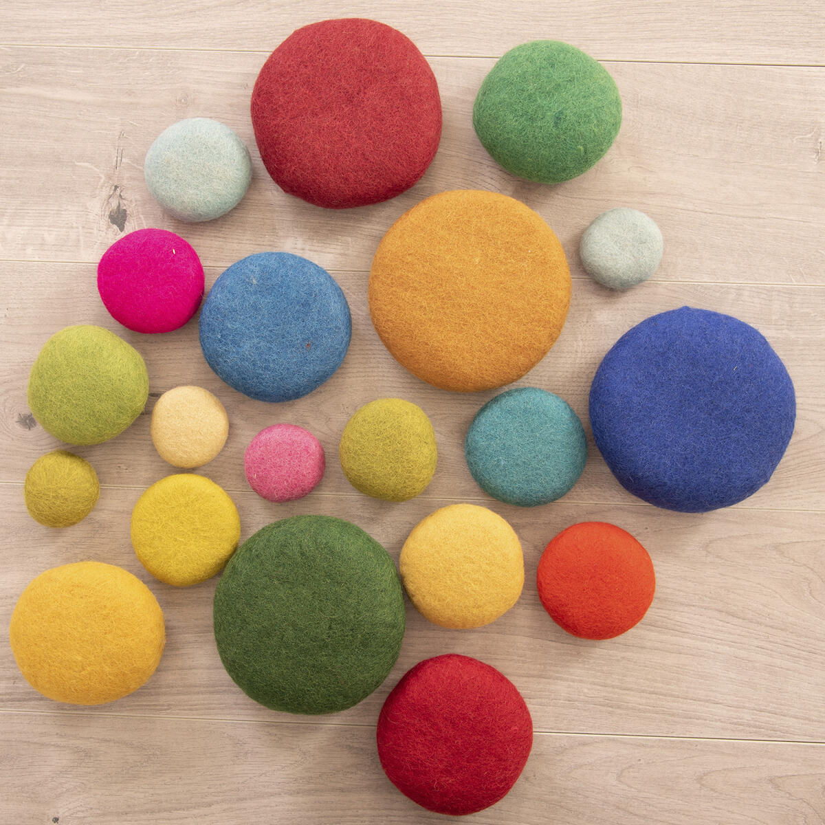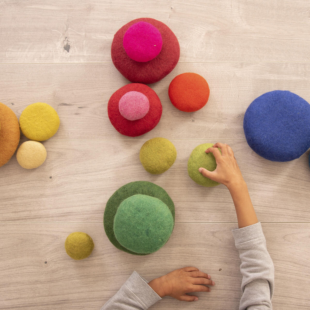 5 st/fp. Filtstenar i olika storlekar och färgtoner för stapling, sortering eller klassificering. Minsta stenen är ø 7 cm och största är ø 16 cm. PVC-fri. Från 10 månader.