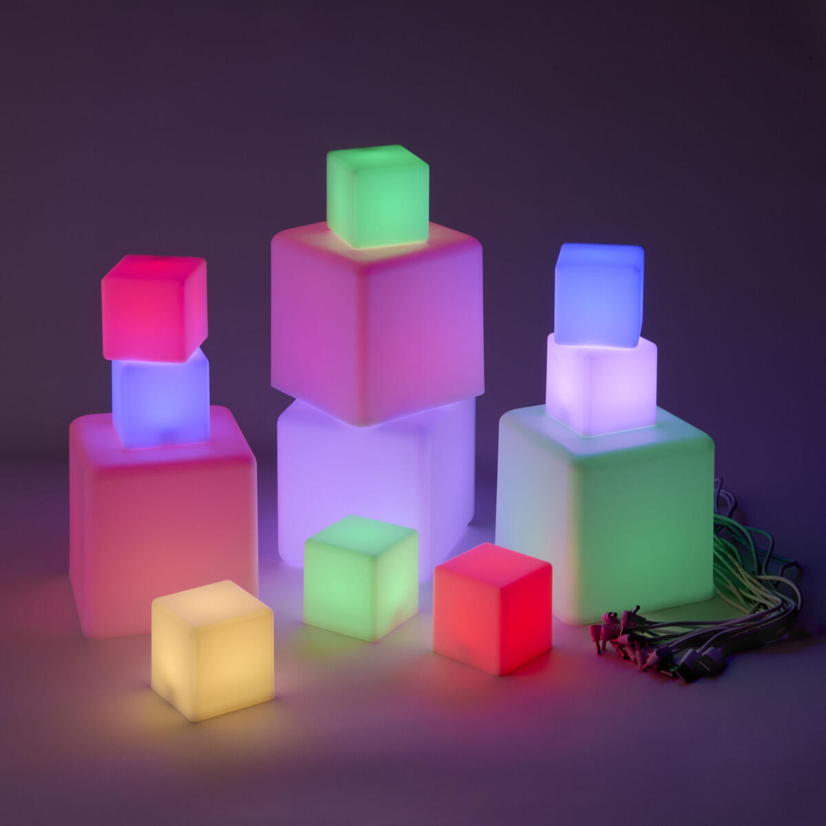 Lysande kuber som ändrar färg när de vänds. Kombinera gärna med transparenta klossar, eller byggklossar Glaciär, för att lysa upp en igloo eller ett färgat fönster. Uppladdningsbara med USB kabel. Av PP. PVC-fri. Från 0 år.