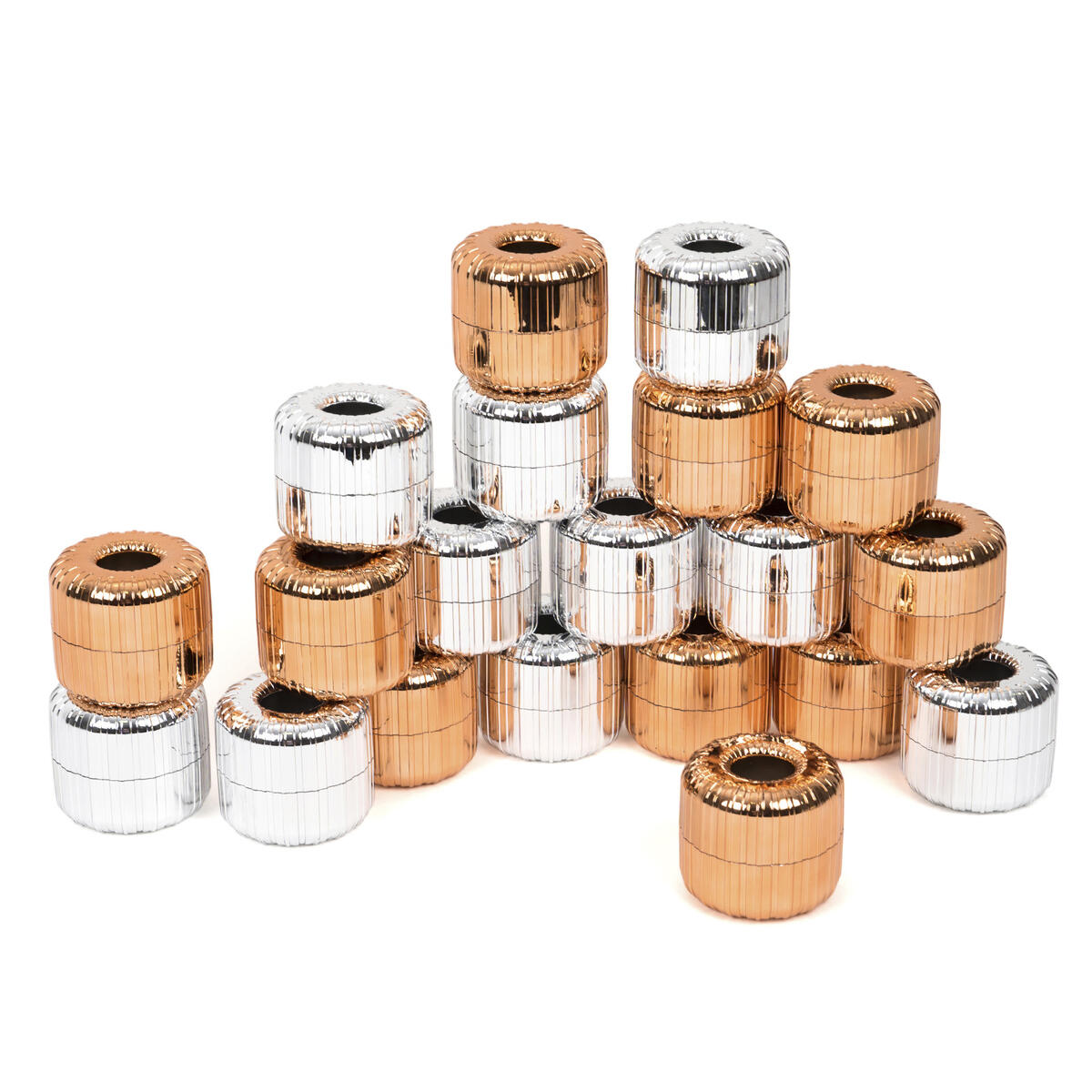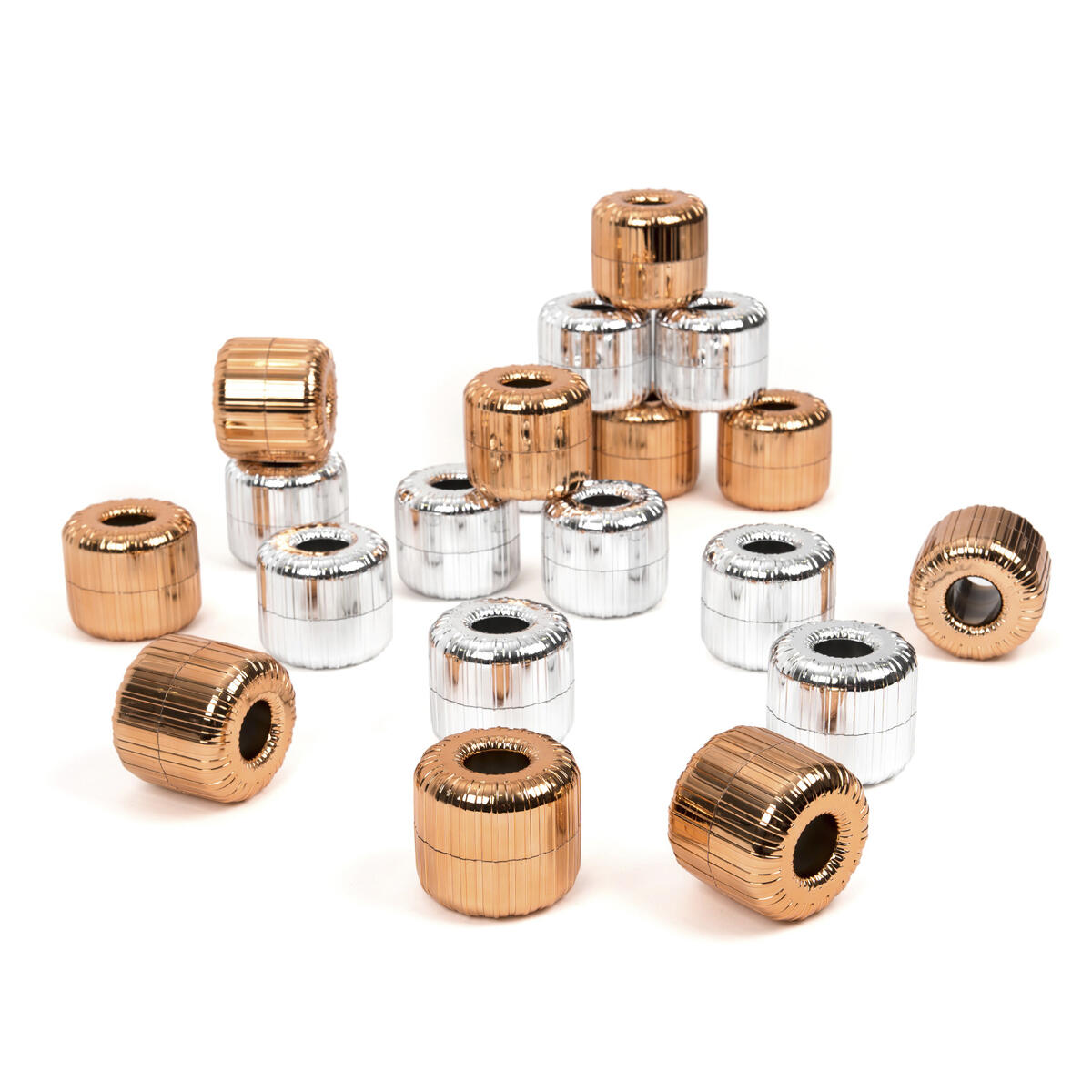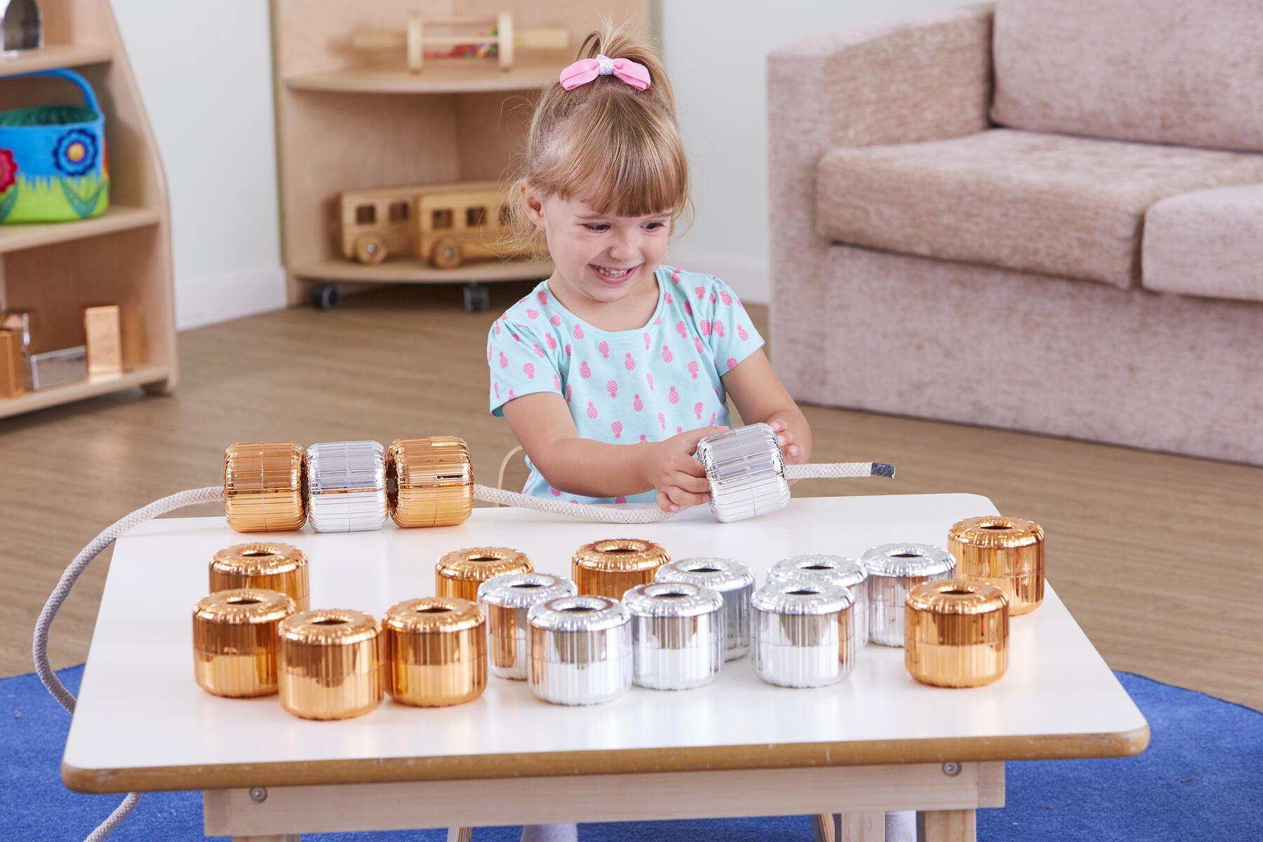 32 st/fp. Fina klossar med en speglande, slät metallfinish. Klossarna har låg vikt och är enkla att greppa. Använd för att stapla, bygga och sortera, eller för att diskutera egenskaper. Uppmuntrar även till samarbete. För användning inomhus och med fördel på mjuka underlag, då vassa föremål kan repa ytan. Måttexempel: cylinder: 10x5 cm. PVC-fri. Från 0 år.