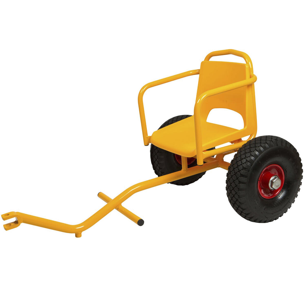Släpvagn med plaststolar i slagtålig plast, med sido- och ryggstöd. Hjulen är gjorda med slutna kullager. Mått: 113x55x55 cm. Av stål och gummi. Från 3 år.