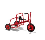 En populär modell som är idealisk för rollekar. Den trehjuliga cykeln är utrustad med kraftiga däck, baksätesplattform, dragkrok och säkerhetshandtag som extra passageraren kan hålla sig fast i. Cykeln levereras monterad. Mått: L107xB66xH71 cm. Sitthöjd 42/32 cm. Av stål, PP och PU. Sits och fotplatta av FSC-märkt trä. PVC-fri. Från 4 år.